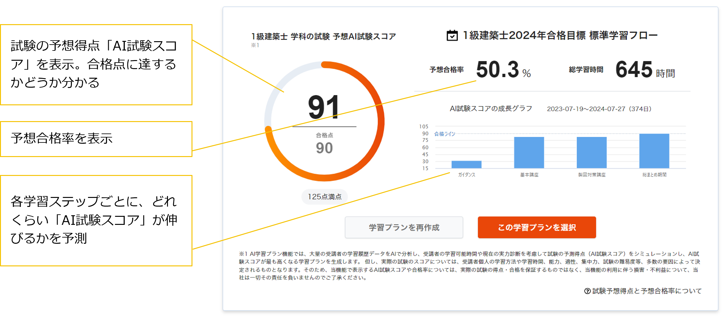 AI学習プラン機能では、受講者にとって試験の予測得点が高くなる学習プランを作成します。そして、試験の予測得点「AI試験スコア」と「予想合格率」が表示されます。