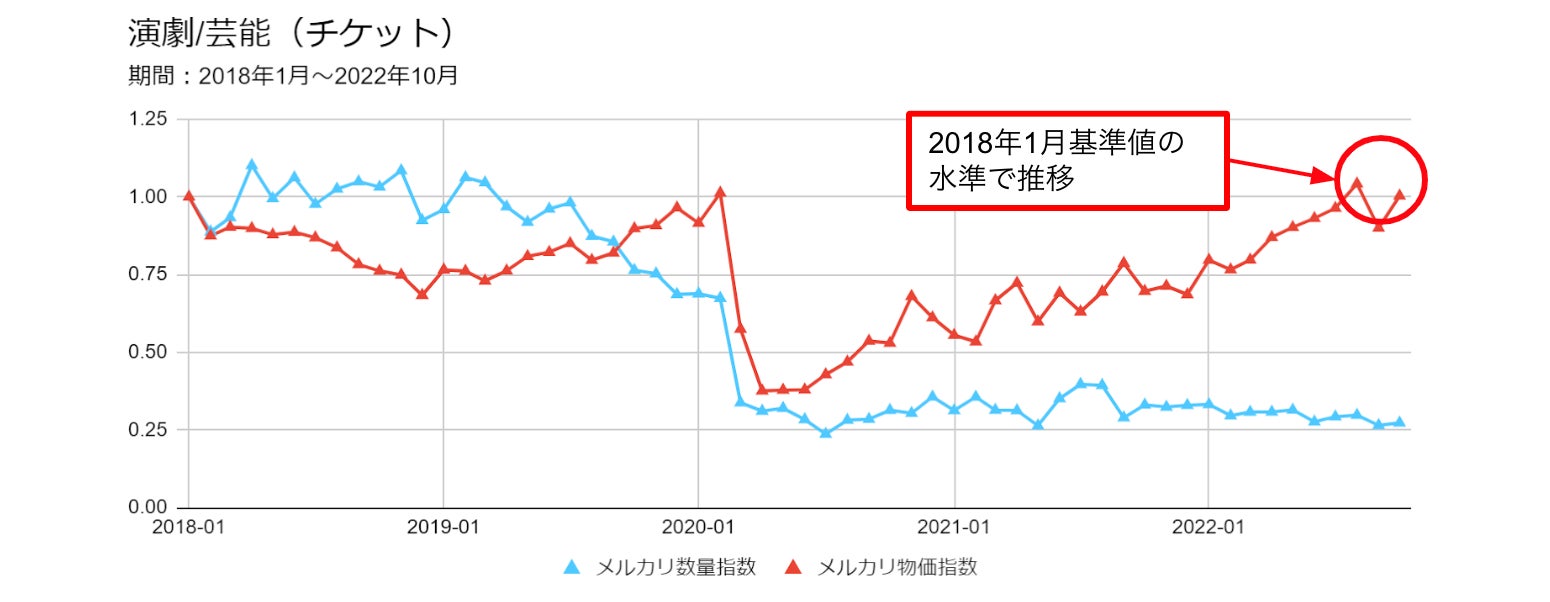 今後の物価指数の推移を見守る必要がある前提にはなりますが、現在は2018年1月の基準値で安定傾向にあることから、落語、サーカス、演劇などのエンターテイメントに対する需要がコロナ前の水準に戻ってきていることが考えられます。