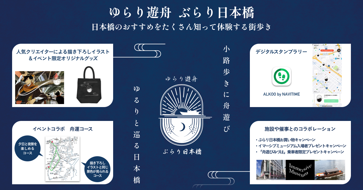 株式会社ナビタイムジャパン(代表取締役社長:大西 啓介、本社:東京都港区、以下「ナビタイムジャパン」)は、三井不動産東大ラボと連携し、2022年10月3日(月)より日本橋エリアにて、日本橋の特色の一つである「舟運」を軸として、「舟遊び×スイーツ×サブカルチャー」をテーマとした、周遊及び購買促進のためのコンテンツツーリズム「ゆらり遊舟(あそびふね) ぶらり日本橋」を実施します。