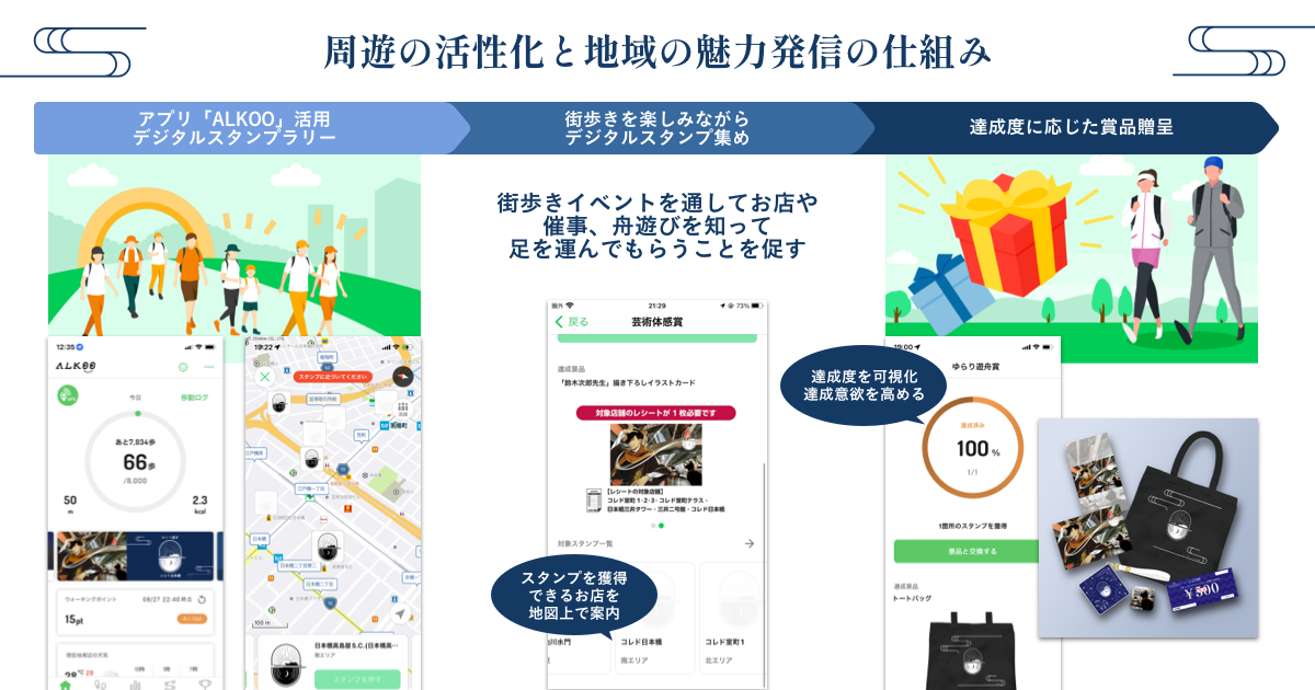 ウォーキングアプリ『ALKOO by NAVITIME』にて、「ゆらり遊舟 ぶらり日本橋」イベントに参加すると、エリア内18か所のチェックポイントでデジタルスタンプを集められます。『ALKOO by NAVITIME』上の、グレート賞・ゴールド賞・シルバー賞・ブロンズ賞いずれかの達成完了画面と、対象店舗での購入レシート1枚を引換場所で提示すると、スタンプ数に応じて、本イベント限定のオリジナルグッズを先着でプレゼントします。