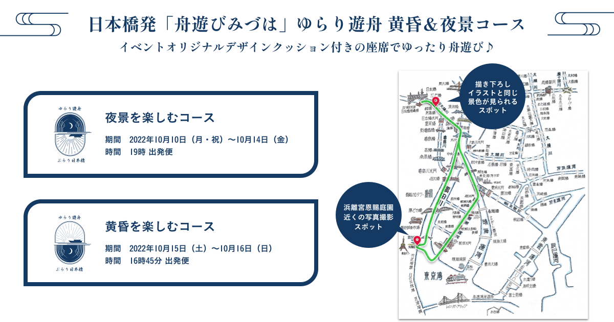 普段は見られない浜離宮庭園越しの東京タワーを楽しめる特別な「ゆらり遊舟 黄昏&夜景コース」を本イベントのために運行します。本イベントオリジナルデザインのクッションが設置され、いつもとは違った座席を演出します。また、デジタルスタンプ1個を集めて舟遊びをした方全員に「ゆらり遊舟賞」として、イベントロゴ入りトートバッグと「舟遊びみづは」のノベルティグッズをプレゼントします。