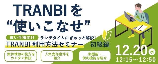 この度、日本最大級の事業承継・M&Aプラットフォームを運営する株式会社トランビ(本社:東京都 港区、以下「トランビ」)は、2023年12月20日(水)に「TRANBIを使いこなせ!ランチタイムにぎゅっと解説!買い手様向け TRANBI利用方法セミナー初級編」をオンライン開催いたします。