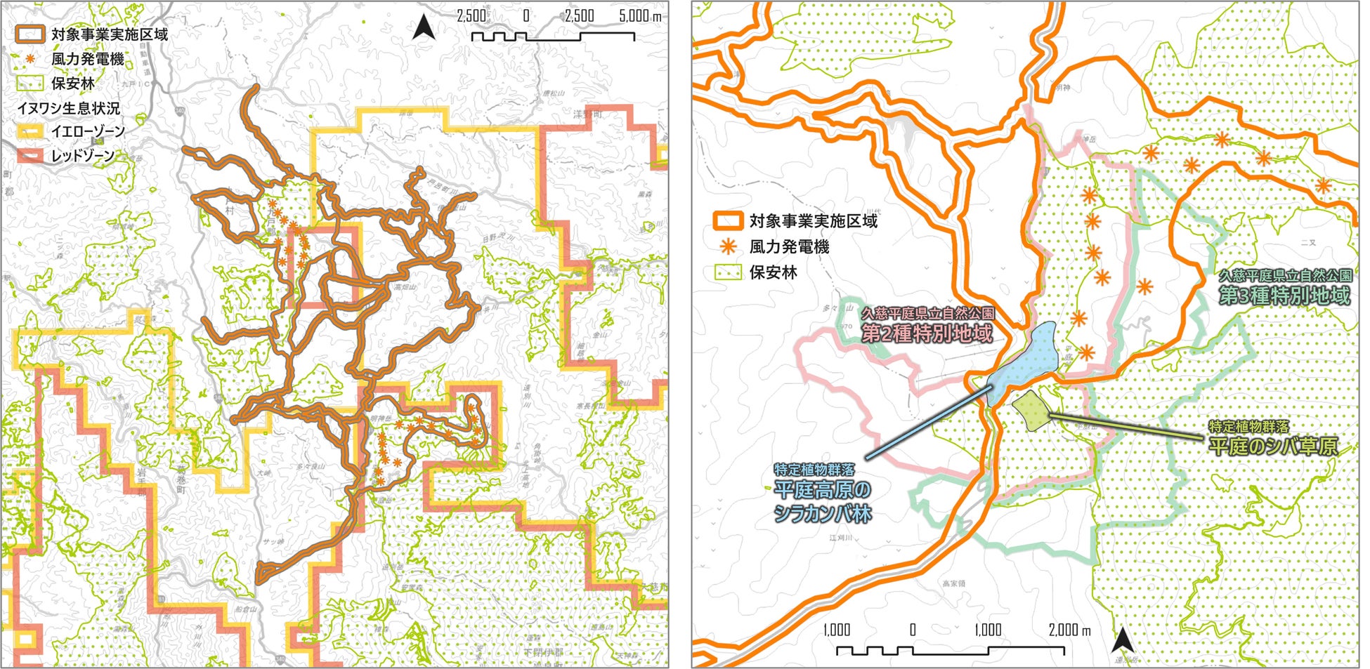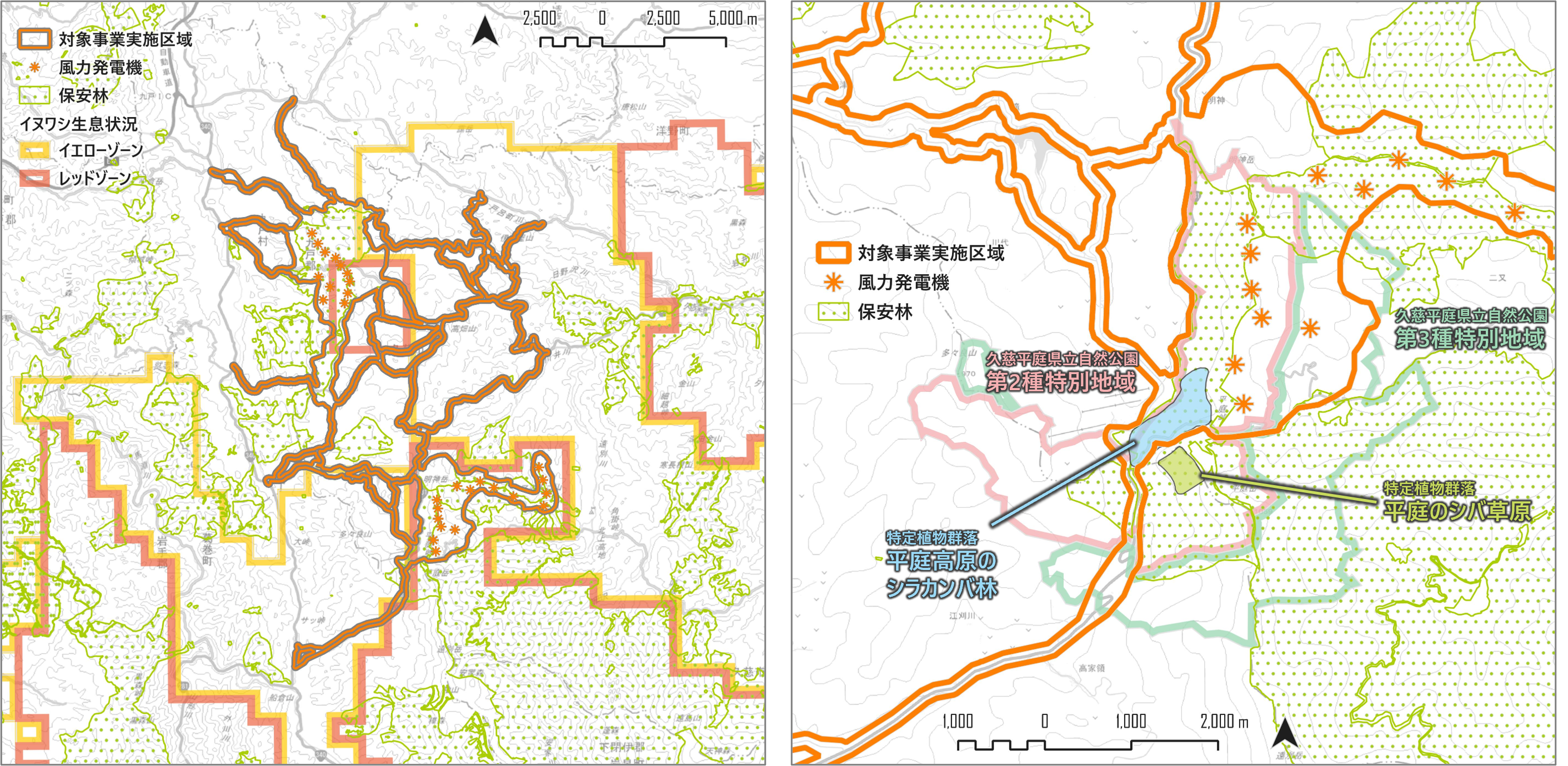 また、県指定の陸上風力発電事業に係る環境アセスのガイドラインにおいて、イヌワシの重要な生息地とされるレッドゾーンに、建設予定28基中22基が含まれている。