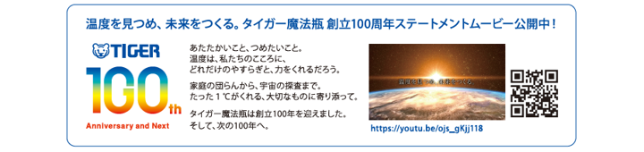 100周年を記念し、新たにタイガー魔法瓶のブランドパートナーとして渡辺直美さんに就任していただきました。渡辺さんが活躍の場を世界へと広げ、挑戦し続けるように、当社は次の100年も「世界中に幸せな団らんを広める。」というVision(ビジョン)を目指し、Mission(ミッション)の「温もりあるアイデアで、食卓に新たな常識をつくり続ける。」を果たすため、真摯なものづくりへの挑戦をこれからも続けてまいります。