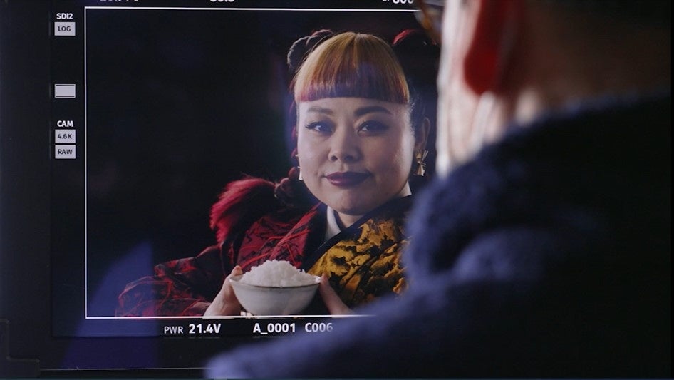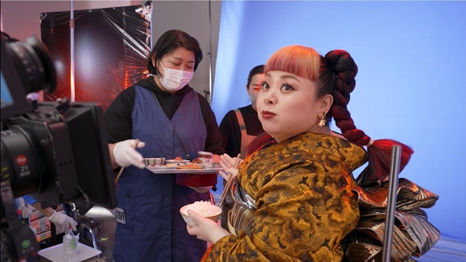 本CMでは、ブランドパートナーである渡辺直美さんを初起用。大火力を表現した「赤」、泡を表現した「金」を用いて特別に作られた、世界に一点だけの豪華な着物で登場しました。強い目力で語る「このおいしさ、まさにごほうび」では、お米好きな渡辺さんだけに、より一層力が入ります。撮影ではJRX型で炊かれたごはんを、大き目のお茶碗に山盛り2杯以上もぺろりと完食するほど、ごはんに対する深い愛情が伝わる撮影になりました。