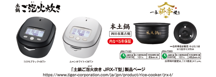 「土鍋ご泡火炊き JRX-T100/T060」は、ほかにも70種類の銘柄巧み炊きわけに加えて、コシヒカリを産地ごとに炊きわける「産地炊き」やアプリ連携で外出先から予約炊飯時間が変更できるIoT機能を新たに搭載。 タイガー魔法瓶の叡智と最新技術を詰め込んだ、100周年記念モデルにふさわしい最高傑作です。100年のその先へ。タイガー魔法瓶のおいしさへの挑戦は続きます。