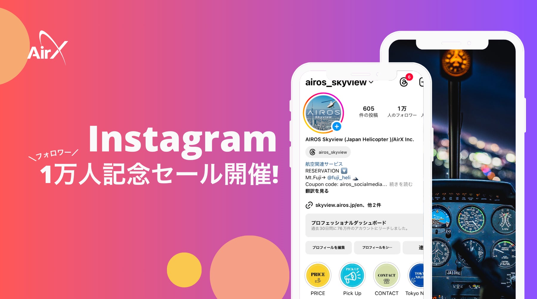 AirX、Instagramフォロワー1万人を記念して、ヘリ遊覧1人1万円〜セール開催