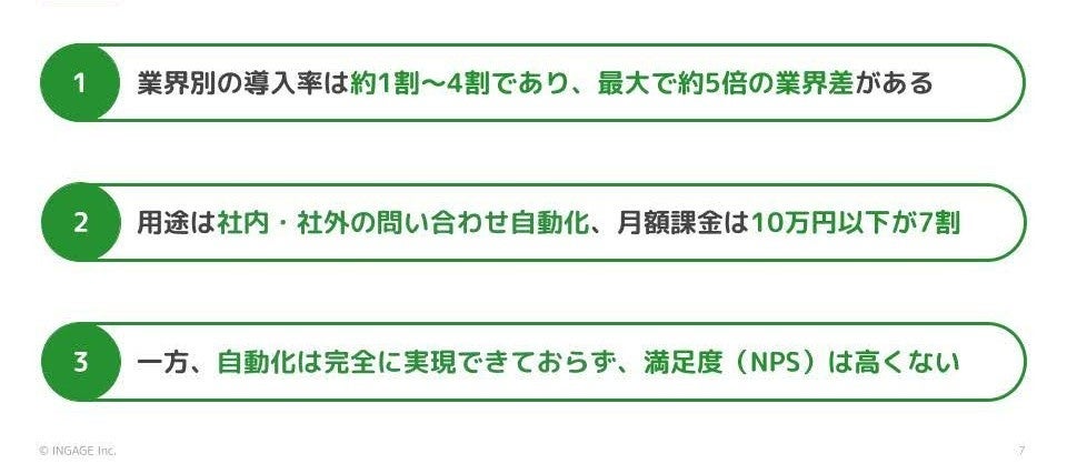 本調査を通じ、チャットボットの導入背景や導入後の課題感を認識することができました。現在、業界、部署問わずチャットボットの導入は進んでおり、社内、社外の問い合わせの自動化を目的に、約7割の企業が月額10万円以下で運用していることが明らかになりました。