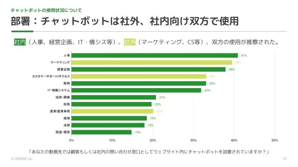 「あなたの勤務先では顧客もしくは社内の問い合わせ窓口としてウェブサイト内にチャットボットを設置されていますか?」と質問した結果、社内(人事、経営企画、ITなど)および社外(マーケティング、CSなど)の両方で利用されていることが確認された。