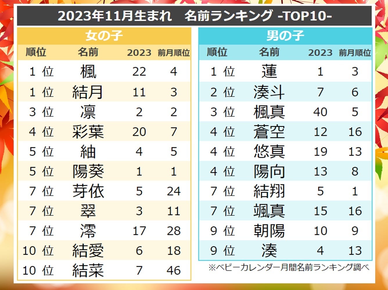 また、女の子の名付け同様、「紅葉ネーム」の代表格の漢字「楓」が男の子の名前でも大注目。2023年の年間漢字ランキングでは43位ですが、10月は27位、11月には16位と秋が深まる11月に人気が高まりました。