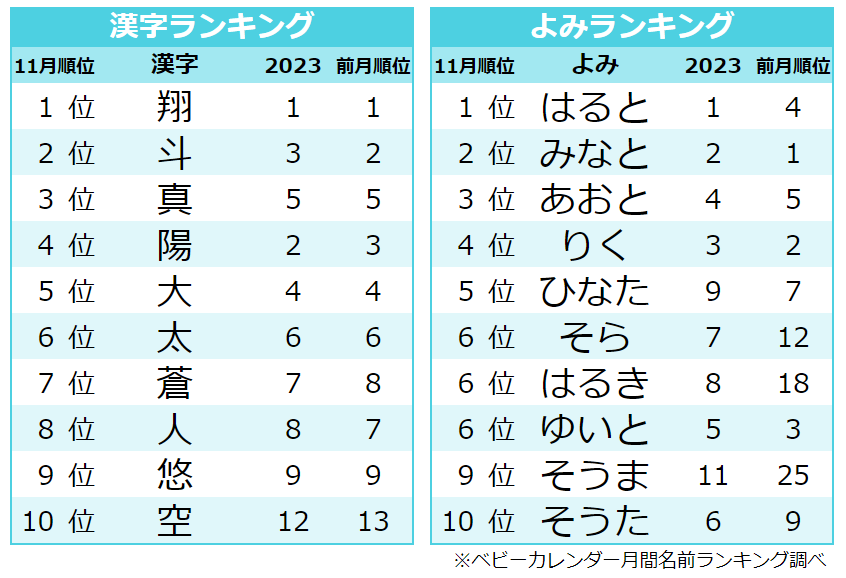 また、秋生まれの名付けでは、よみに「あき」がつく名前が増加します。なかでも「暁」を用いた名前に注目が集まりました。「暁斗(主なよみ:あきと)」が10月は40位から11月は31位へ、「千暁(主なよみ:ちあき)」も圏外から11月は65位へとランクアップ。先月に引き続き「秋ネーム」に人気が集まりました。