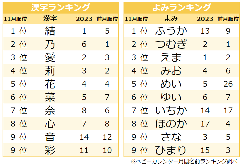 < 11月生まれ >女の子に人気の名前の漢字・よみランキング