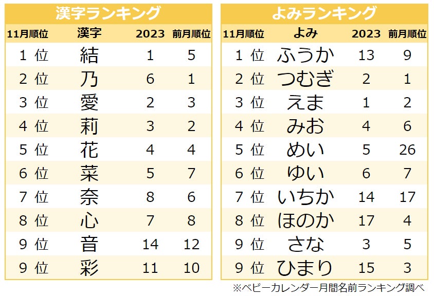 また、鮮やかに色づく紅葉をイメージする「彩」を用いた「彩葉(主なよみ:いろは)」が4位にランクイン。葉が花のように色づくことを意味する「椛(主なよみ:もみじ)」は、2023年の年間漢字ランキングでは圏外でしたが、月間ランキングでは10月48位、11月は40位とこの時季だけ2カ月連続でTOP50にランクインしています。11月は、名前ランキング57位「椛乃(主なよみ:かの)」、73位「結椛(主なよみ:ゆいか)」、149位「椛(主なよみ:もみじ)」などの名前に用いられ、秋らしさを取り入れた「秋ネーム」に人気が集まりました。