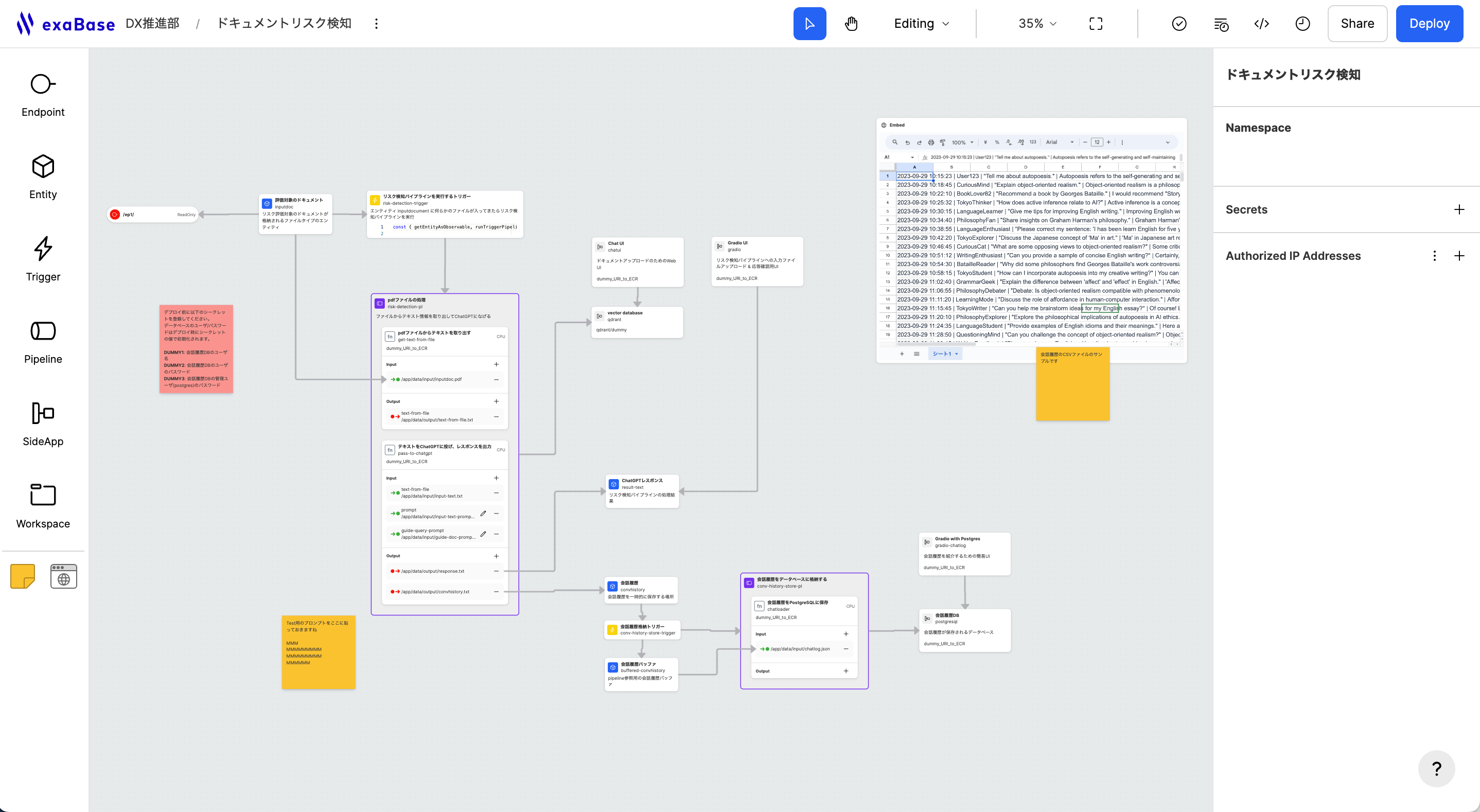 exaBase Studioは、社内外のAIモデルやサービス、データを組み合わせて、AIソフトウェアを構築できる開発環境です。キャンバスと呼ぶ直感的にわかりやすい設計・開発用のUI(ユーザーインターフェース)を活用して処理を可視化し、エンジニア以外に、経営者や業務をよく知る社内外の人材を巻き込んだオープンな設計や更新が容易となります。開発の煩雑な手順を半自動化する仕組みを搭載しており、開発のプロセスが大きく変わります。「動くものを触りながら改善する」というアジャイル型での内製開発を支援します。