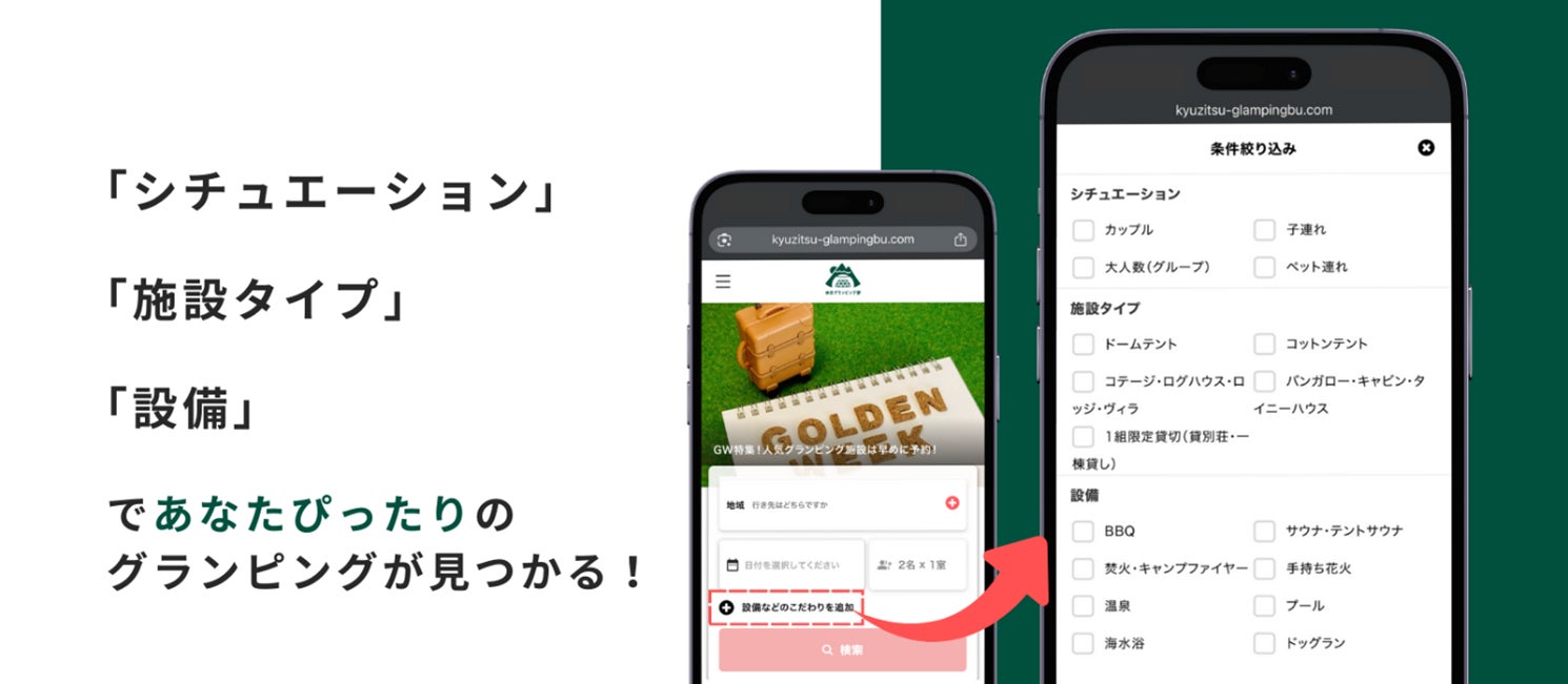この度リリースした「休日グランピング部」は、全国の人気グランピング宿泊施設が探せる専門メディアです。ユーザーが自分にぴったりのプランを見つけられるよう、直感的で充実した検索機能を提供します。