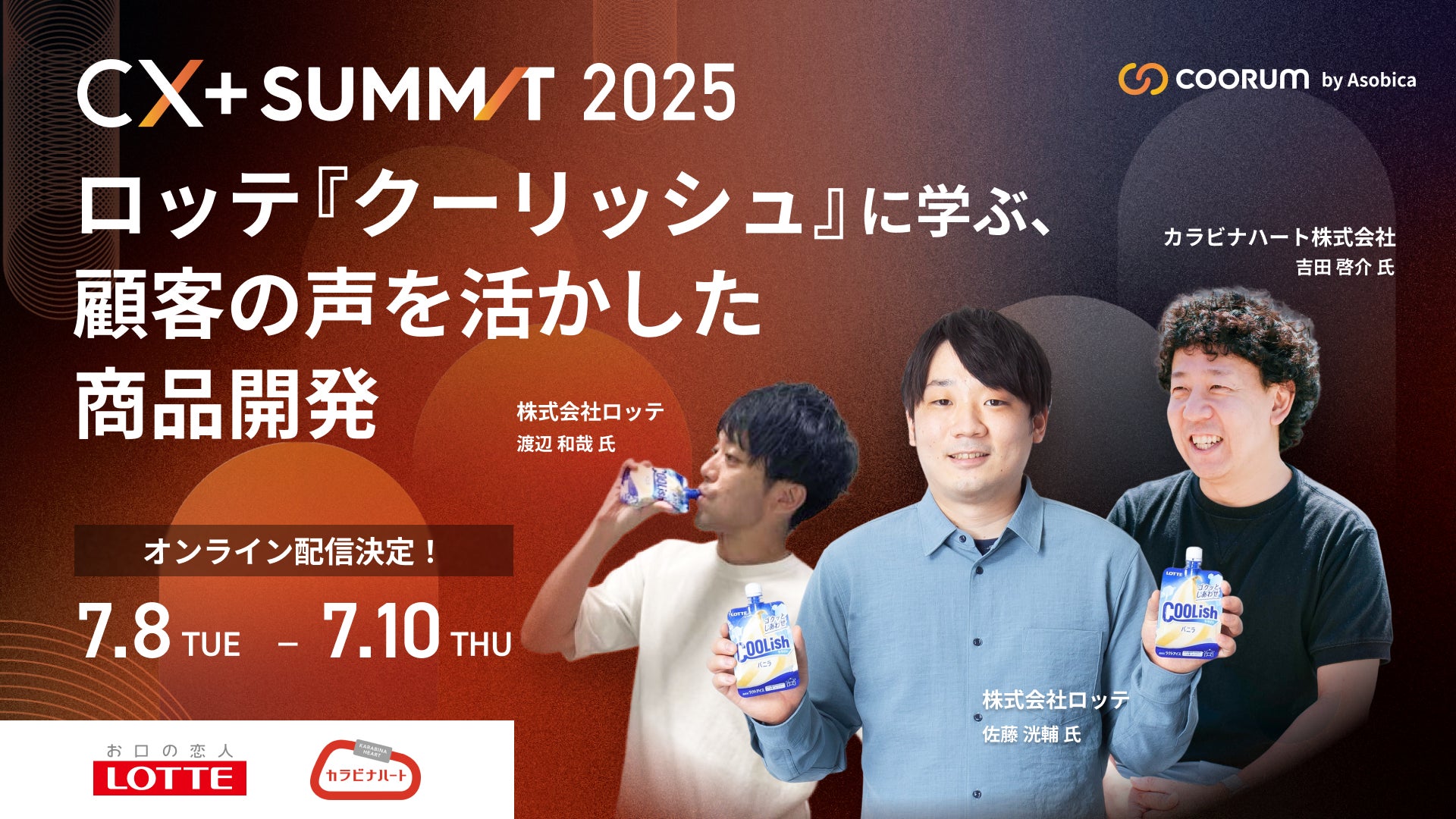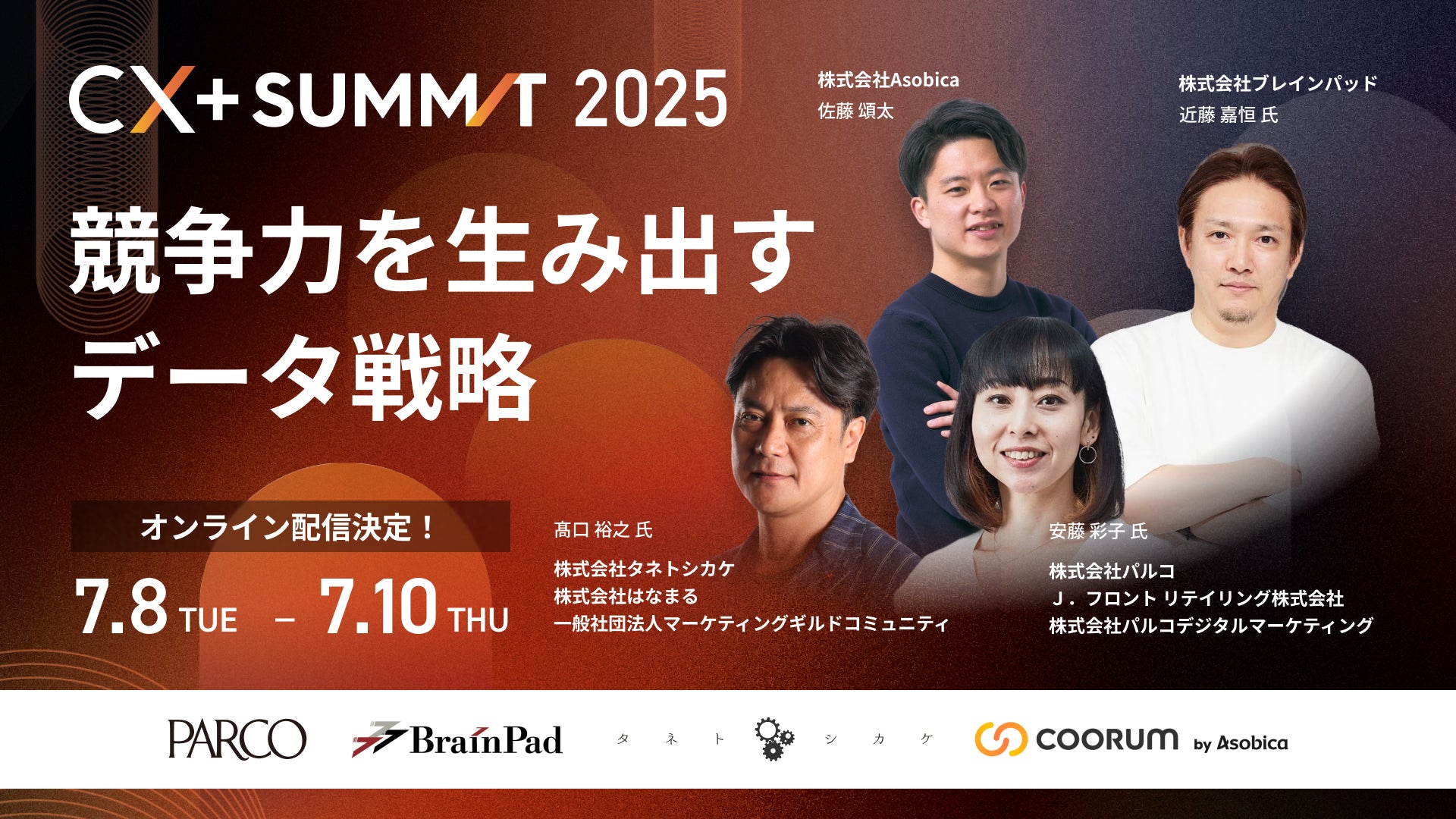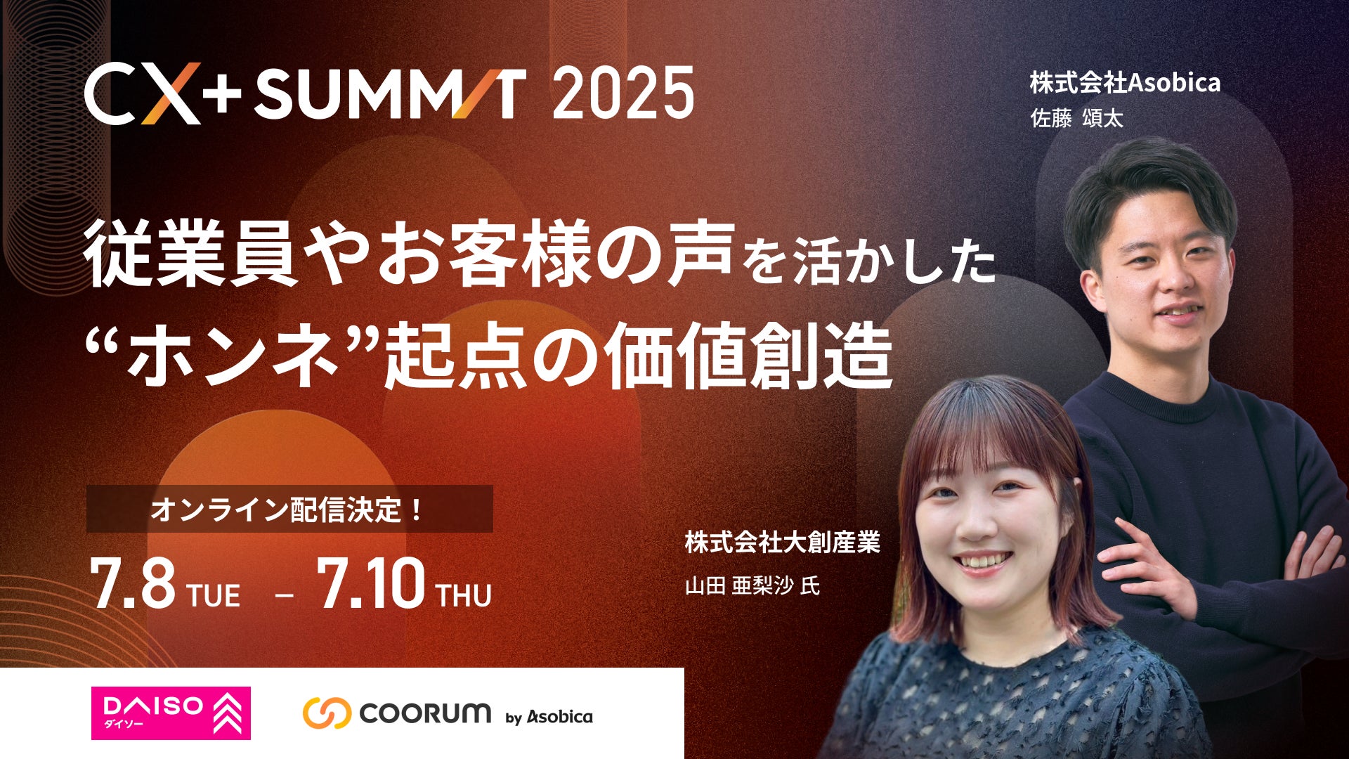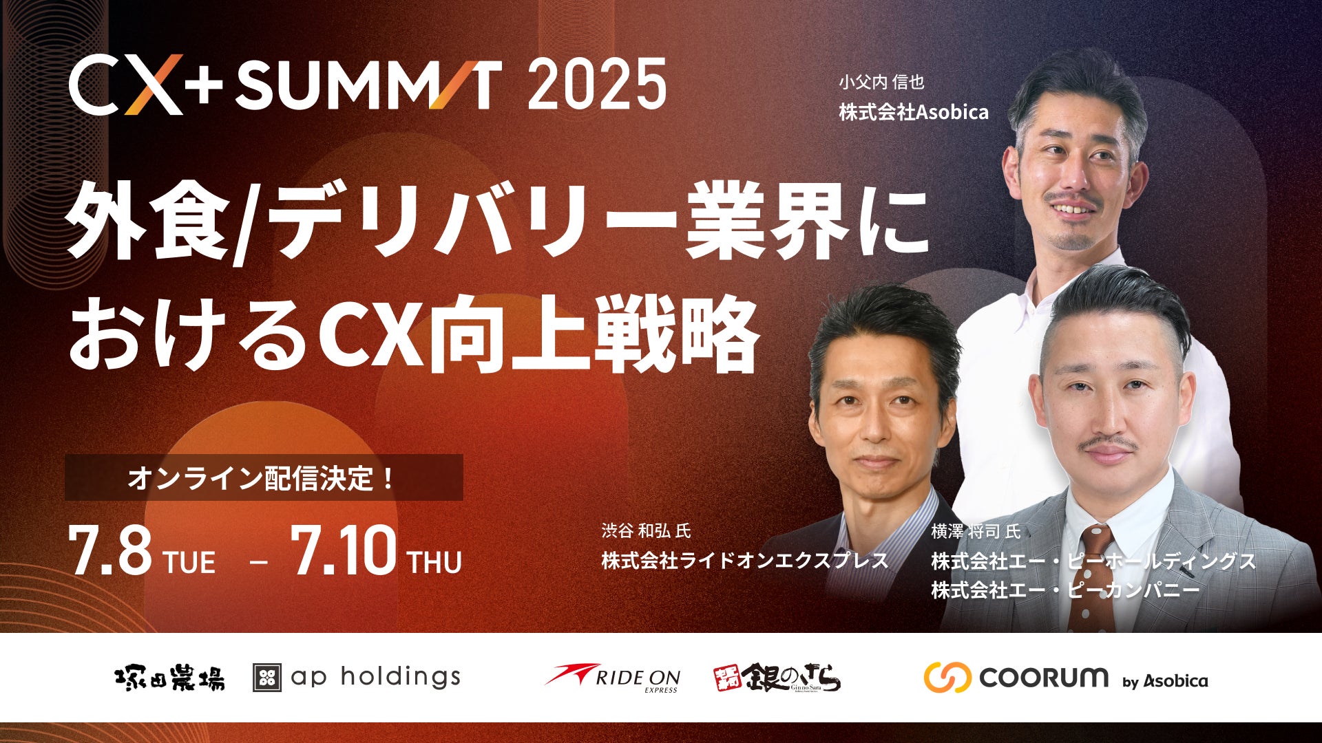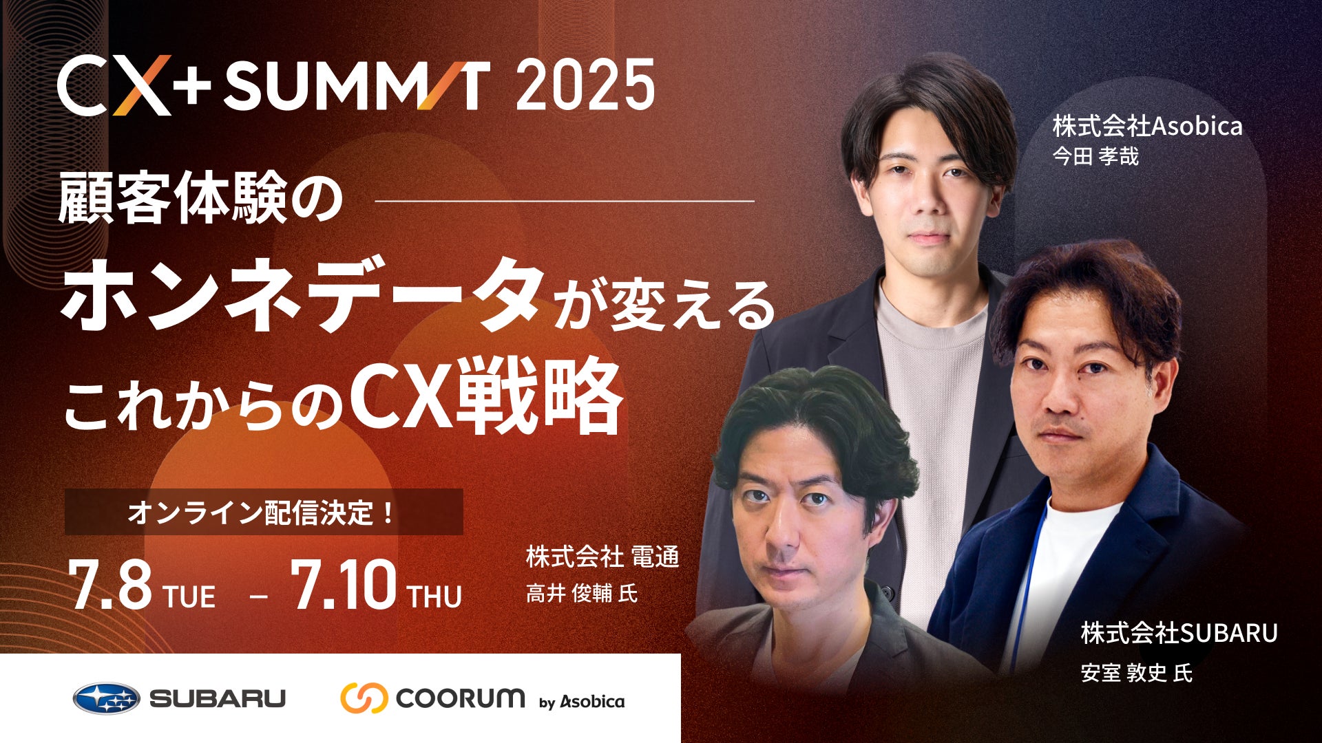 株式会社Asobica(本社所在地:東京都品川区、代表取締役CEO:今田 孝哉)は、5月16日(金)に開催した「CX+ Summit 2025」を、2025年7月8日(火)から7月10日(木)の3日間のみ視聴できる、オンライン配信を実施いたします。