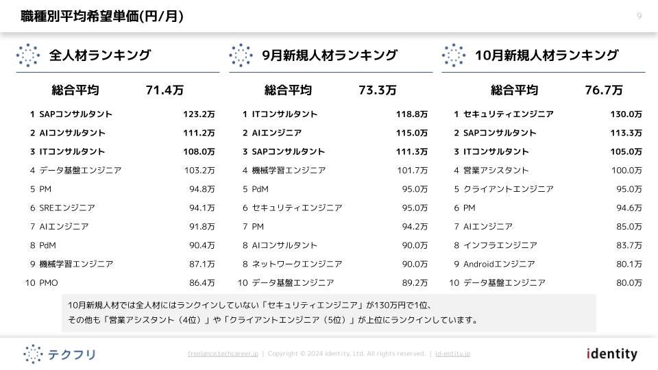 10月新規人材では全人材にはランクインしていない「セキュリティエンジニア」が130万円で1位、
