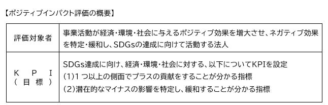 ポジティブインパクト評価とは、企業活動が経済・環境・社会に与えるインパクト(ポジティブ並びにネガティブな影響)を包括的に分析・評価するもので、企業活動の継続的な支援を目的としています。