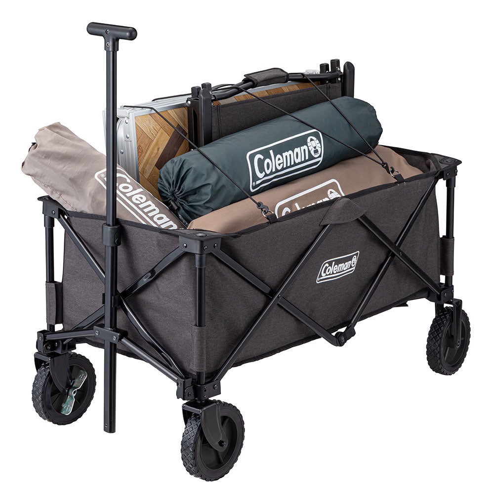 コールマンの人気のアウトドアワゴンが難燃生地、ヘザーブラックカラーで登場。耐荷重100kgで、荷物が崩れることを防止するラバーバンドが付属し、たくさんの荷物がラクラク運べる大型ワゴン。収納時は簡単かつコンパクトに収束可能なので、キャンプアイテムの運搬だけでなく、スポーツシーンや日常使いでもお使いいただけます。また、タイヤには積み下ろしの際にも安全で便利なストッパー付きです。