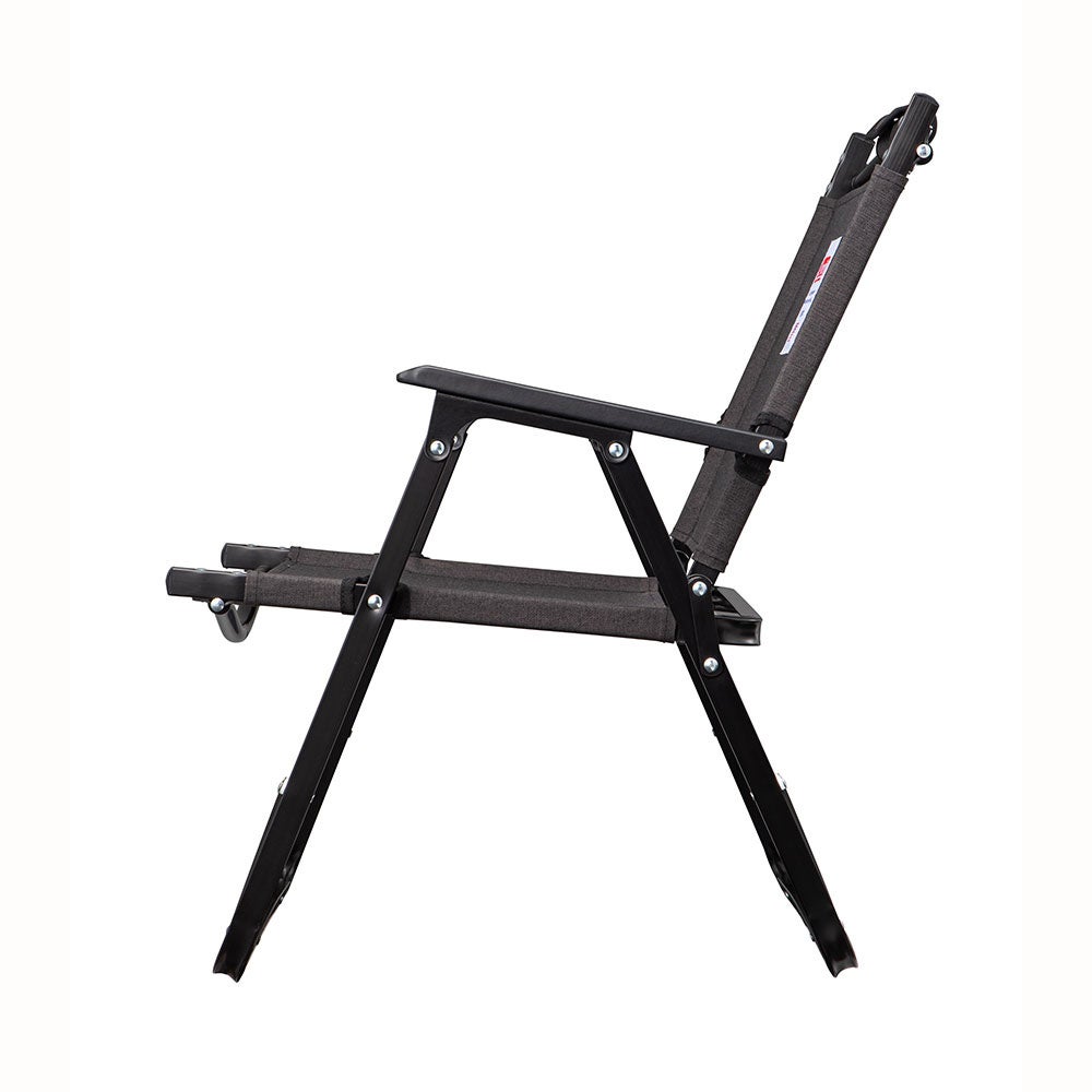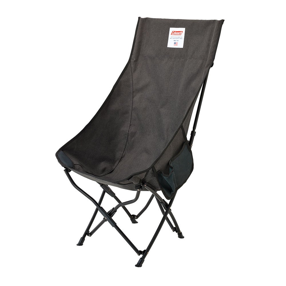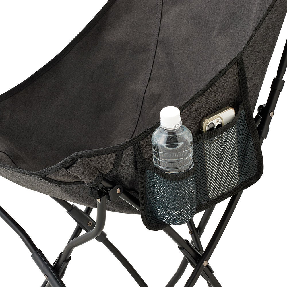 頭までゆったり寄りかかってリラックスできるロースタイルのハイバックチェアが難燃生地、ヘザーブラックカラーで登場。ドリンクやスマートフォンといった小物を入れておくのに便利なサイドポケットが付属。また、フレームと座面を取り外し可能なうえ、背面フレームも小さく折り畳めるため、その座り心地からは想像できないほどコンパクトに収納できます。