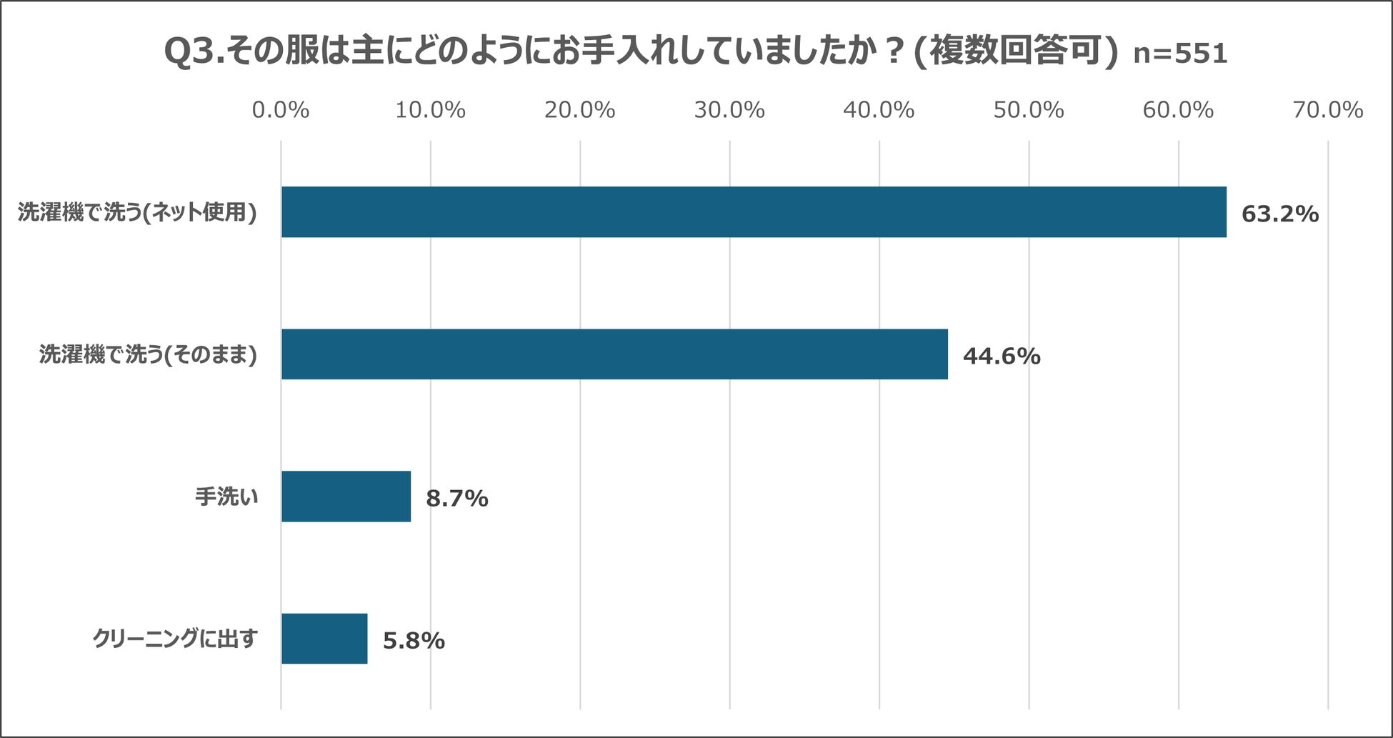 「その服は主にどのようにお手入れしていましたか?(複数回答可)」という質問に対し、「洗濯機(ネット使用)」が63.2%、「そのまま洗う」が44.6%と、多くの方が自宅で洗濯をしている結果となりました。一方で、「クリーニング」や「手洗い」といった方法を選ぶ人は少なく、手軽に家庭で洗えることが、夏服を選ぶ際の重要なポイントの一つとなっていることがうかがえます。