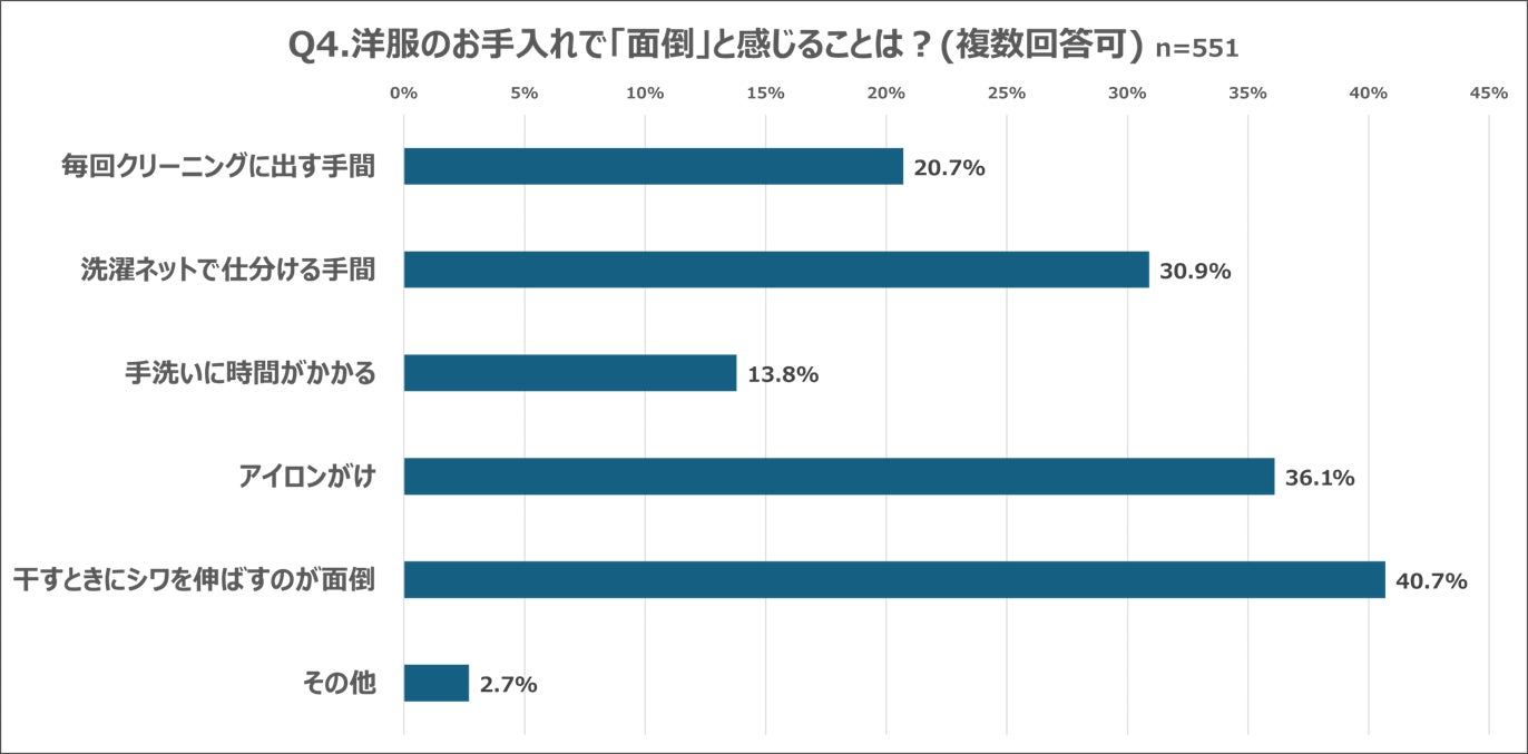 「洋服のお手入れで『面倒』と感じることは?」という質問に対し、「干すときにシワを伸ばす」(40.7%)、「アイロンがけ」(36.1%)が上位に挙がりました。日常的なお手入れの負担は“シワ対策”や“アイロンがけ”といった“見た目を整える作業”に集中しており、『清潔感のなさ』や『だらしなさ』といった印象につながる要素として、多くの人が気を配っていることが明らかになりました。