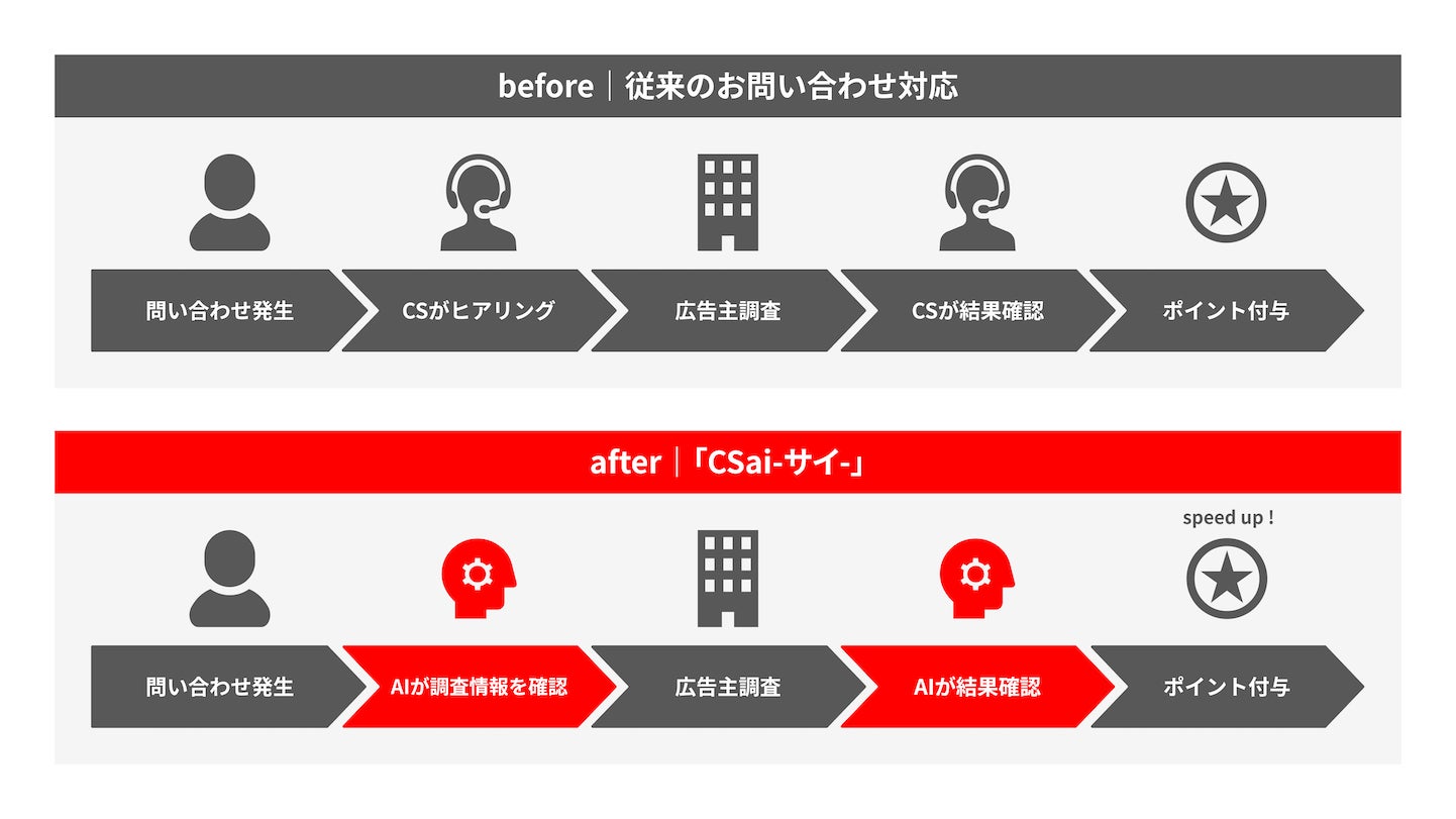 しかし、この度、新機能としてリリースを行った「CSai-サイ-」を活用することで、ユーザーからの問い合わせに迅速かつ正確に対応できるようになり、カスタマーサービス部門の業務も効率化され、ユーザーにとってより快適なリワード広告体験を提供することが可能となります。