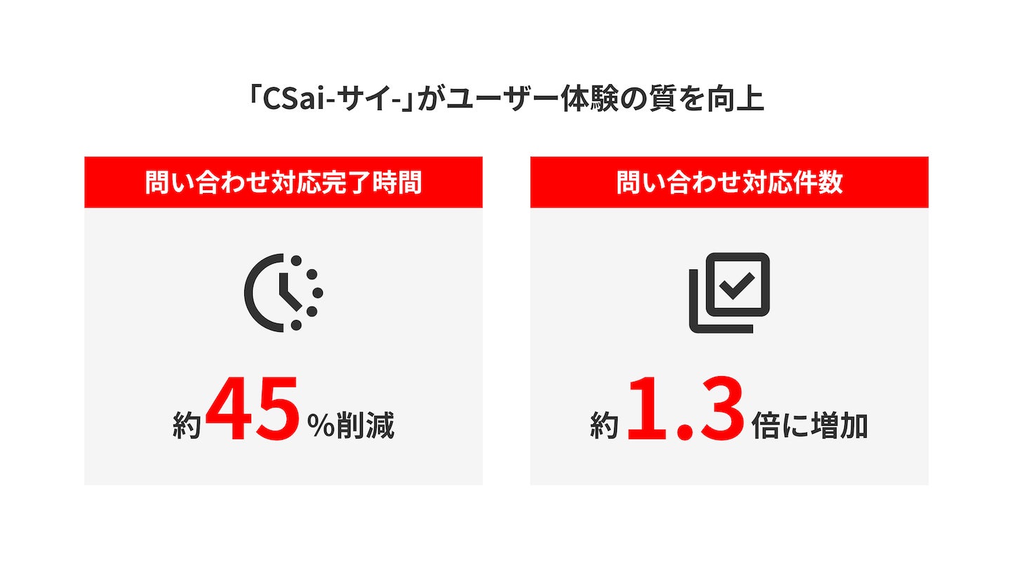 「CSai-サイ-」は、2024年9月にβ版の運用を開始し、検証と改善を重ねてまいりました。テスト環境では、作業時間の削減と生産性の向上が実現され、インセンティブの付与までの時間が従来と比べて約45%短縮でき、また、カスタマーサービス部門で対応できる件数も特定時間内に1.3倍に増加させ、ユーザー体験の向上とサポート体制の強化も行いました。