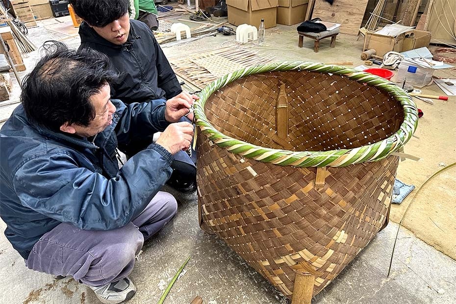 竹製品の修理を通じて持続可能な社会を目指し、熟練職人から若手職人への伝統技術継承に取り組んでいます。その取り組みの中で、京都のお茶農家から預かった傷んだ特大茶籠を竹虎の職人が修理させていただきました。