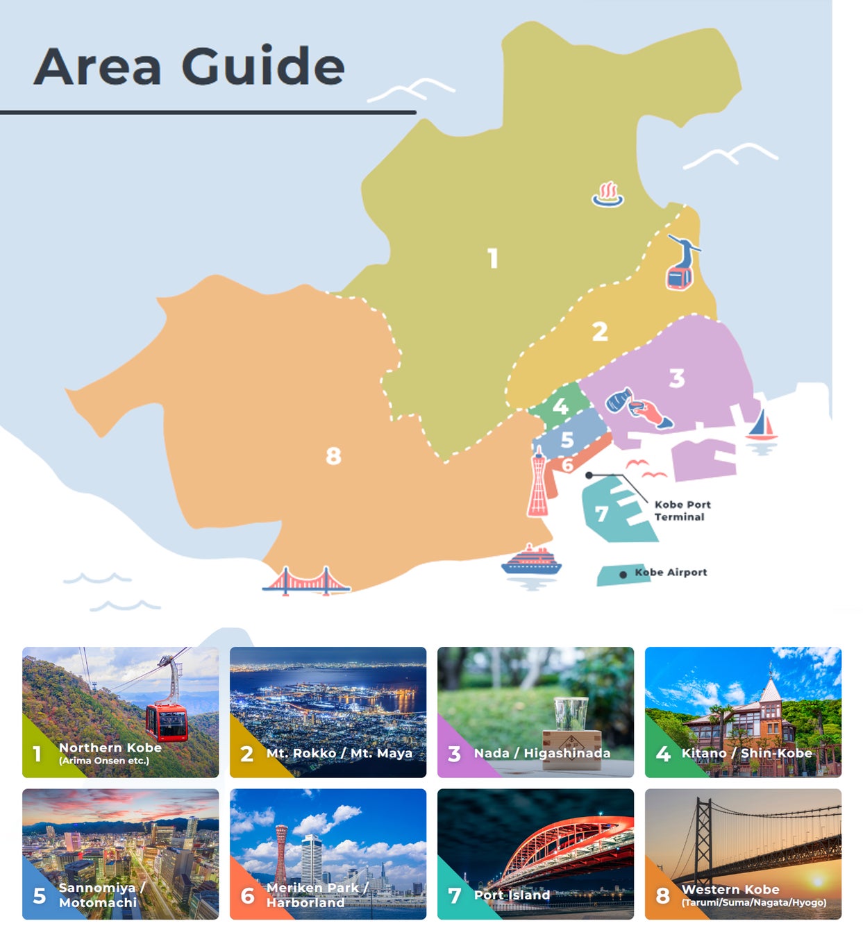 ・回遊を促すエリアガイドの掲載: 六甲山/摩耶山、北野/新神戸など市内エリアを8つに分け、それぞれの特徴を写真付きで詳しく紹介。特定スポットに留まらない市内広域の周遊を促進します。
