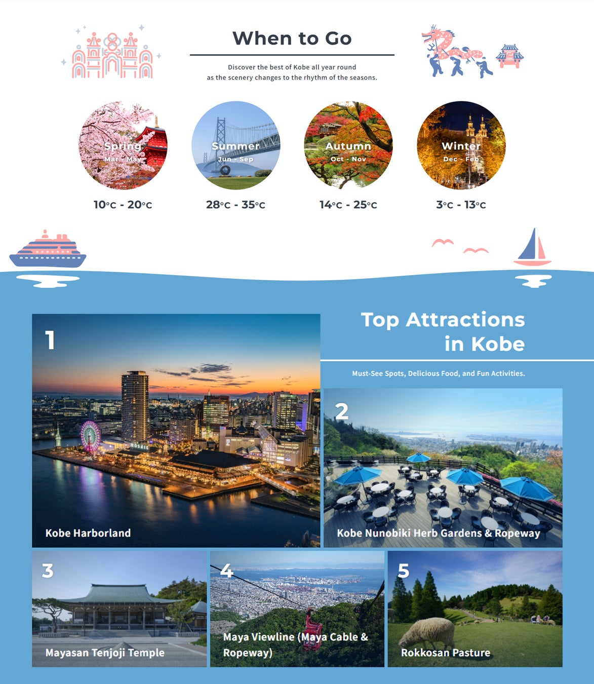 ・視覚的に分かりやすい情報構成: 四季折々の風景やイベントなど、季節ごとの神戸の楽しみ方を紹介するページを充実。アクセスページではイラストマップなども活用し、他都市からのアクセスを分かりやすく紹介しています。