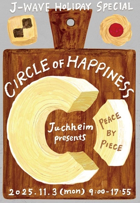 株式会社ユーハイム(本社:神戸市中央区港島中町7-7-4 代表取締役社長:河本英雄 以下、ユーハイム)は、ラジオ局J-WAVE(81.3FM)にて、11月3日(月・祝)の9:00~17:55に「J-WAVE HOLIDAY SPECIAL Juchheim presents CIRCLE OF HAPPINESS -PEACE BY PIECE-」を放送します。