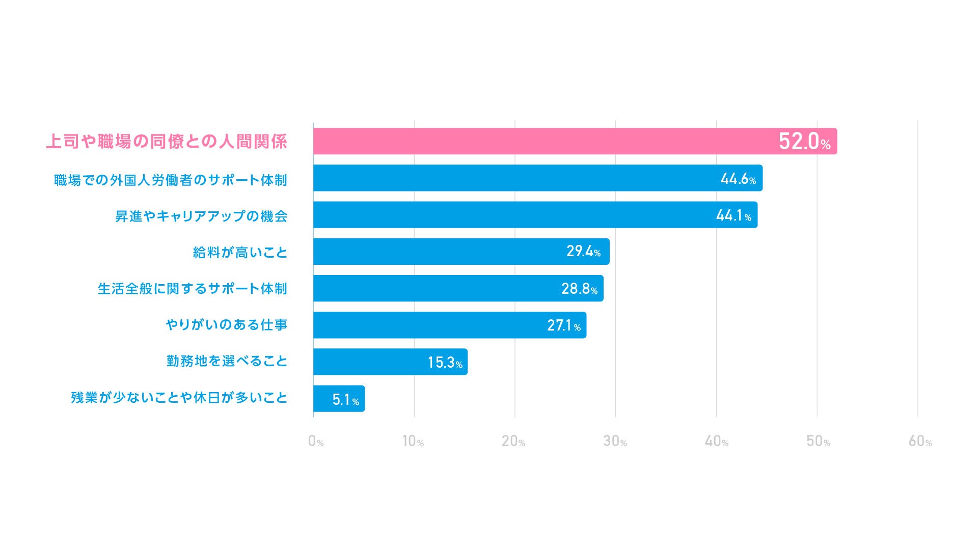日本で働く上で大切にしたいことを調査したところ「上司や職場の同僚との人間関係(52.0%)」が最も多く、次いで「職場での外国人労働者へのサポート体制(44.6%)」「昇進やキャリアアップの機会(44.1%)」となりました。