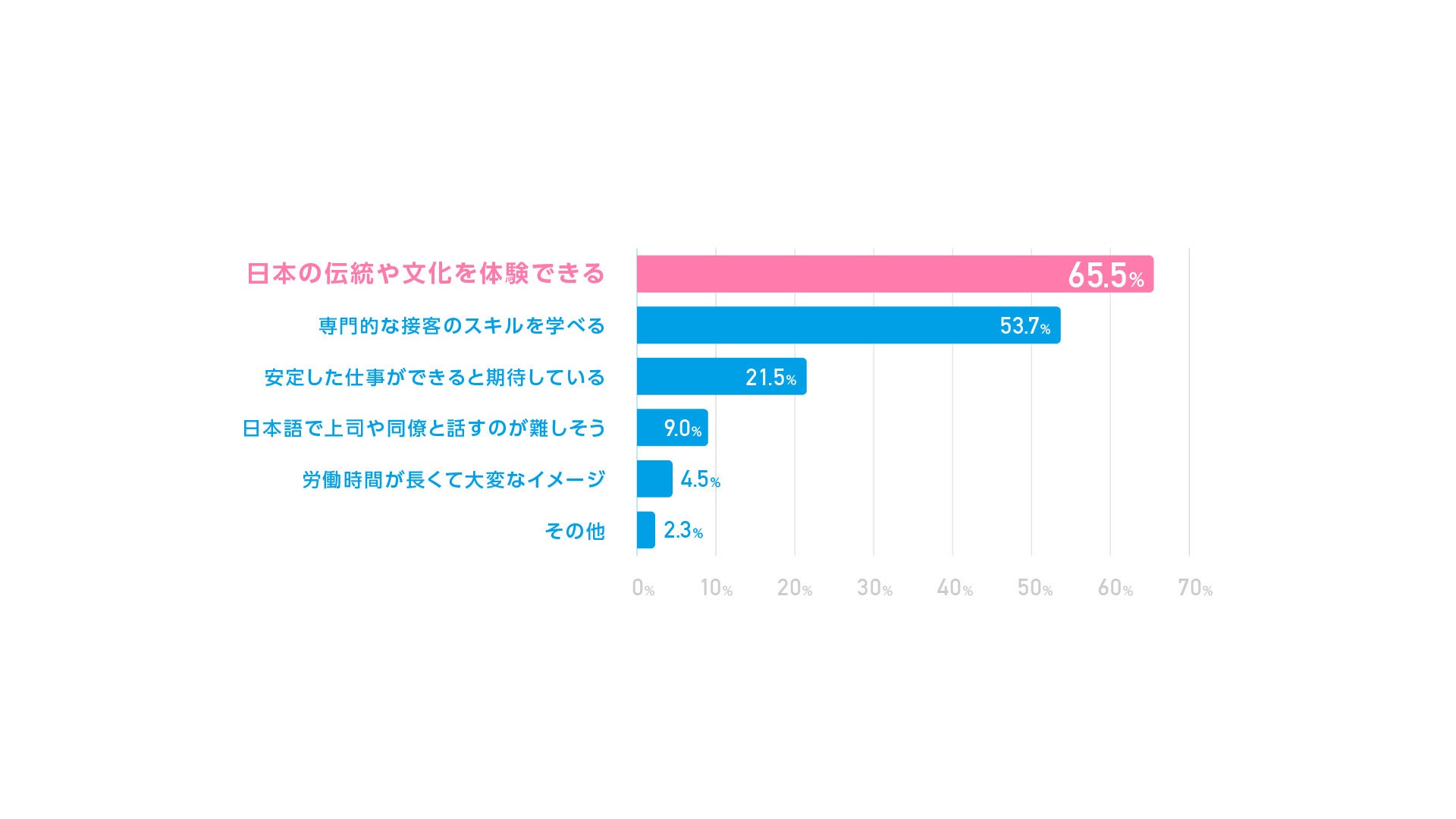 日本のホテルや旅館に対する印象を調査したところ、多くの外国人人材が「日本の伝統や文化を体験できる(65.5%)」と回答しました。次いで「専門的な接客スキルを学べる(53.7%)」「安定した仕事ができると期待している(21.5%)」という結果が続き、宿泊業で働くことに対してポジティブな印象を持つ外国人人材が多いことがわかります。