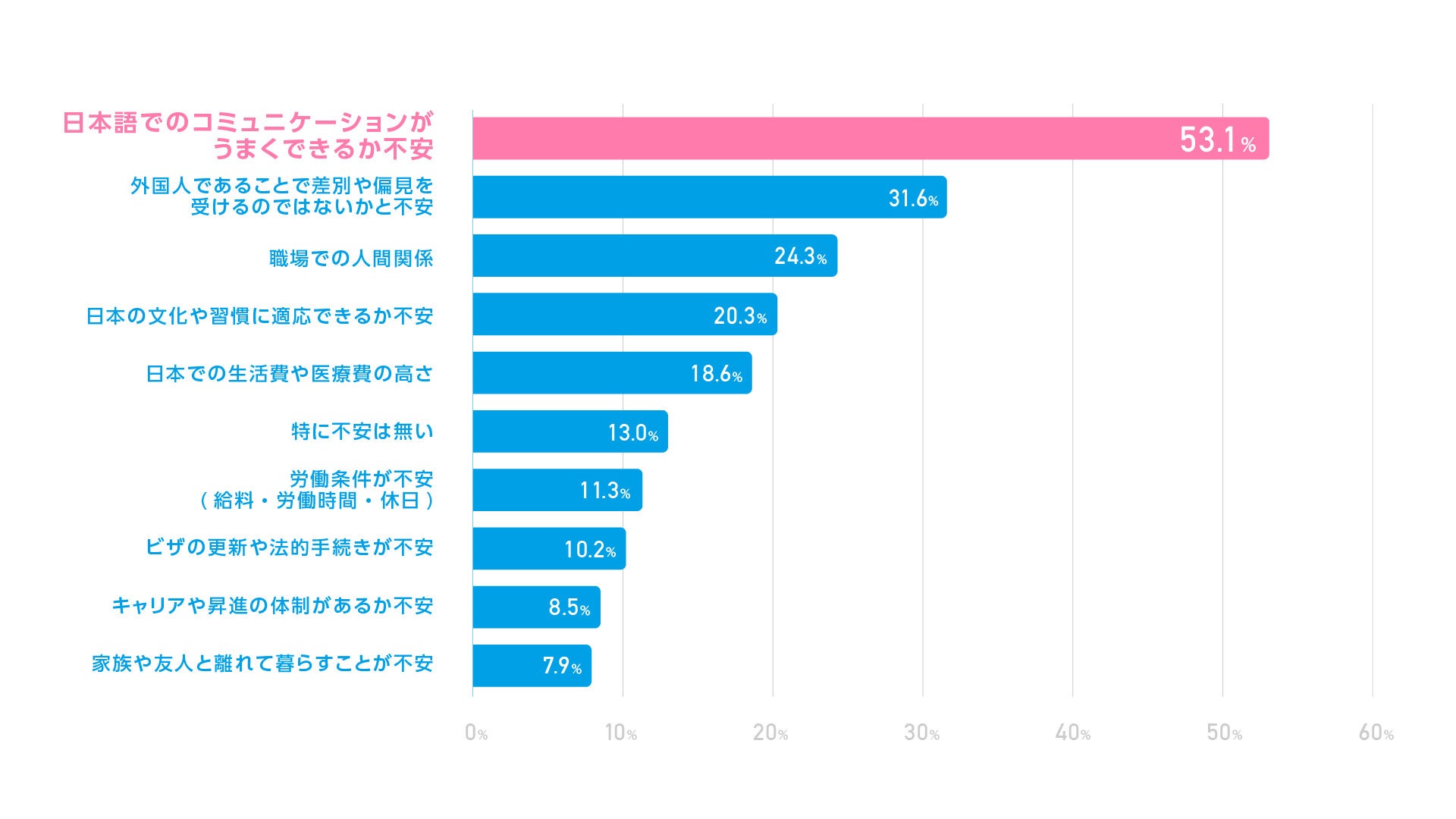 日本で働く上でどんな不安があるか調査したところ「日本語でのコミュニケーションがうまくできるか不安(53.1%)」が最も多く、次いで「外国人であることで差別や偏見を受けるのではないかと不安(31.6%)」「職場での人間関係(24.3%)」となりました。