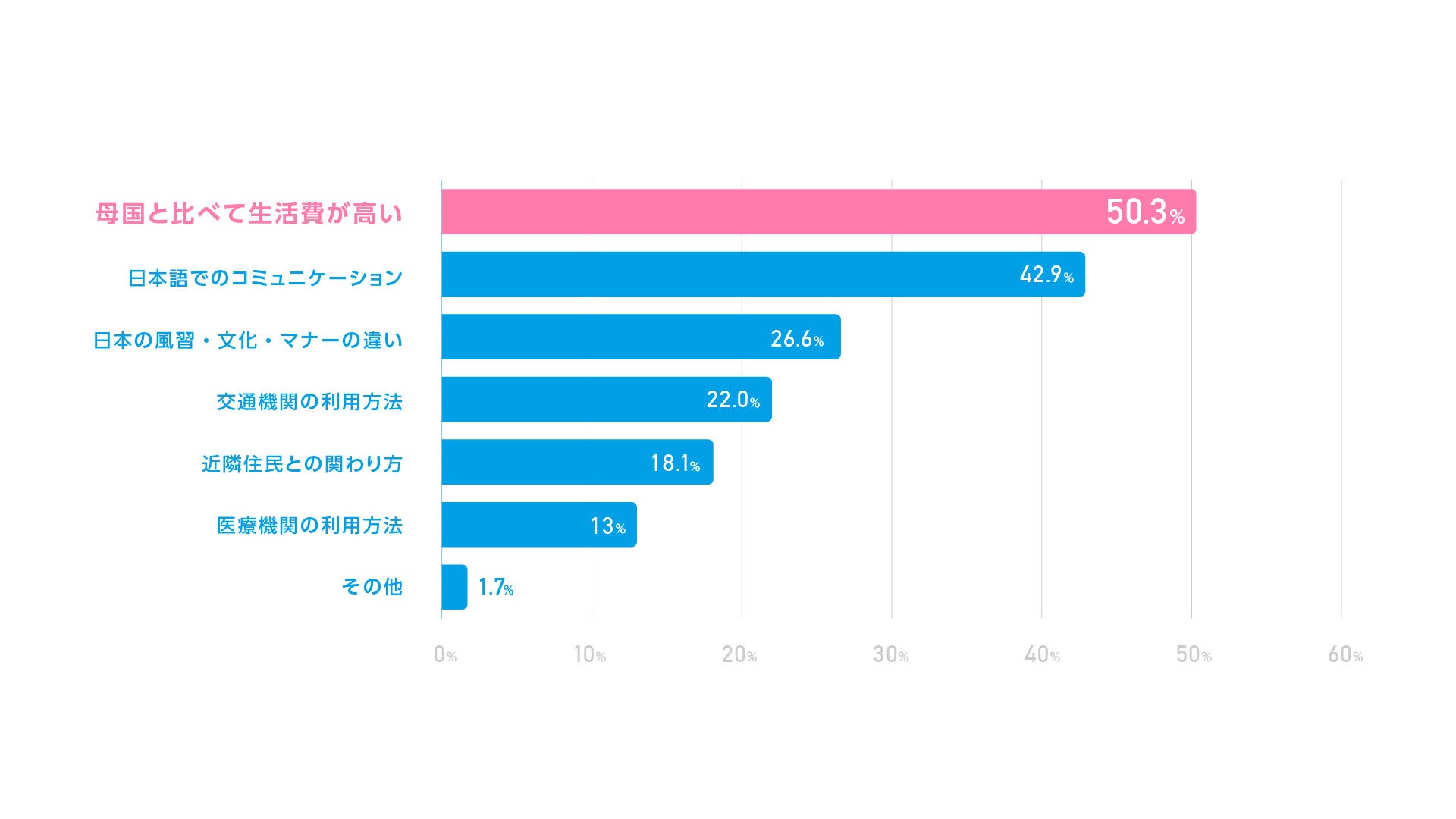 日本での生活環境で気になることとして最も多い回答は「母国と比べて生活費が高い(50.3%)」となり、次いで「日本語でのコミュニケーション(42.9%)」「日本の風習・文化・マナーの違い(26.6%)」という結果となりました。