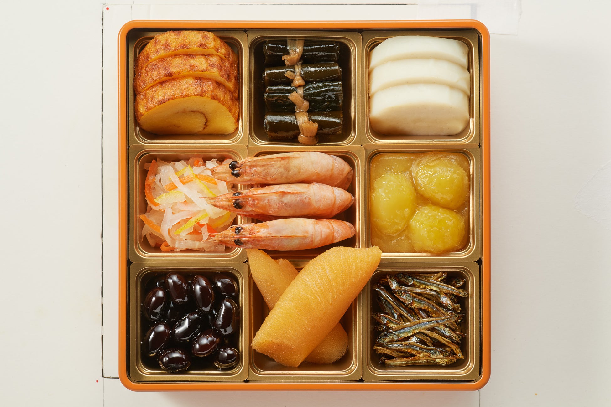 16品ある料理および付属品は、日本を8つの地域に分けて、各地域からとれた原材料や生産されたものを使用しており、“日本の魅力”を感じていただきたいという思いを込めています。お重・祝箸・干支の置物にも“縁起”の意味を込めており、新しい一年の始まりを祝うおせちです。