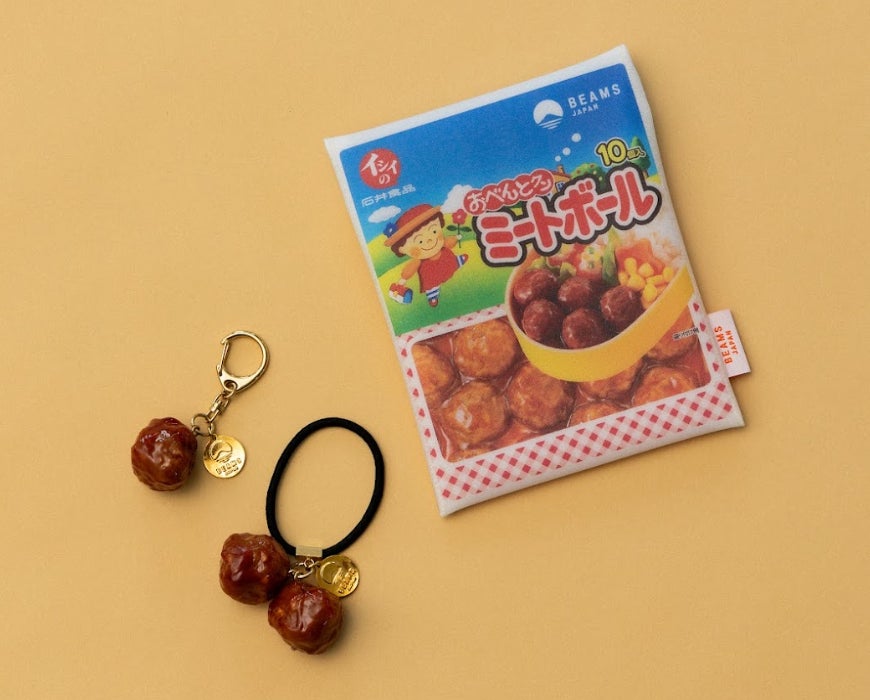 パッケージをモチーフにしたポーチと、「さんぷる工房」製作のキーホルダーとヘアゴムをご用意しました。本物の「イシイのおべんとクンミートボール」そっくりな食品サンプルのスペシャルアイテムです。