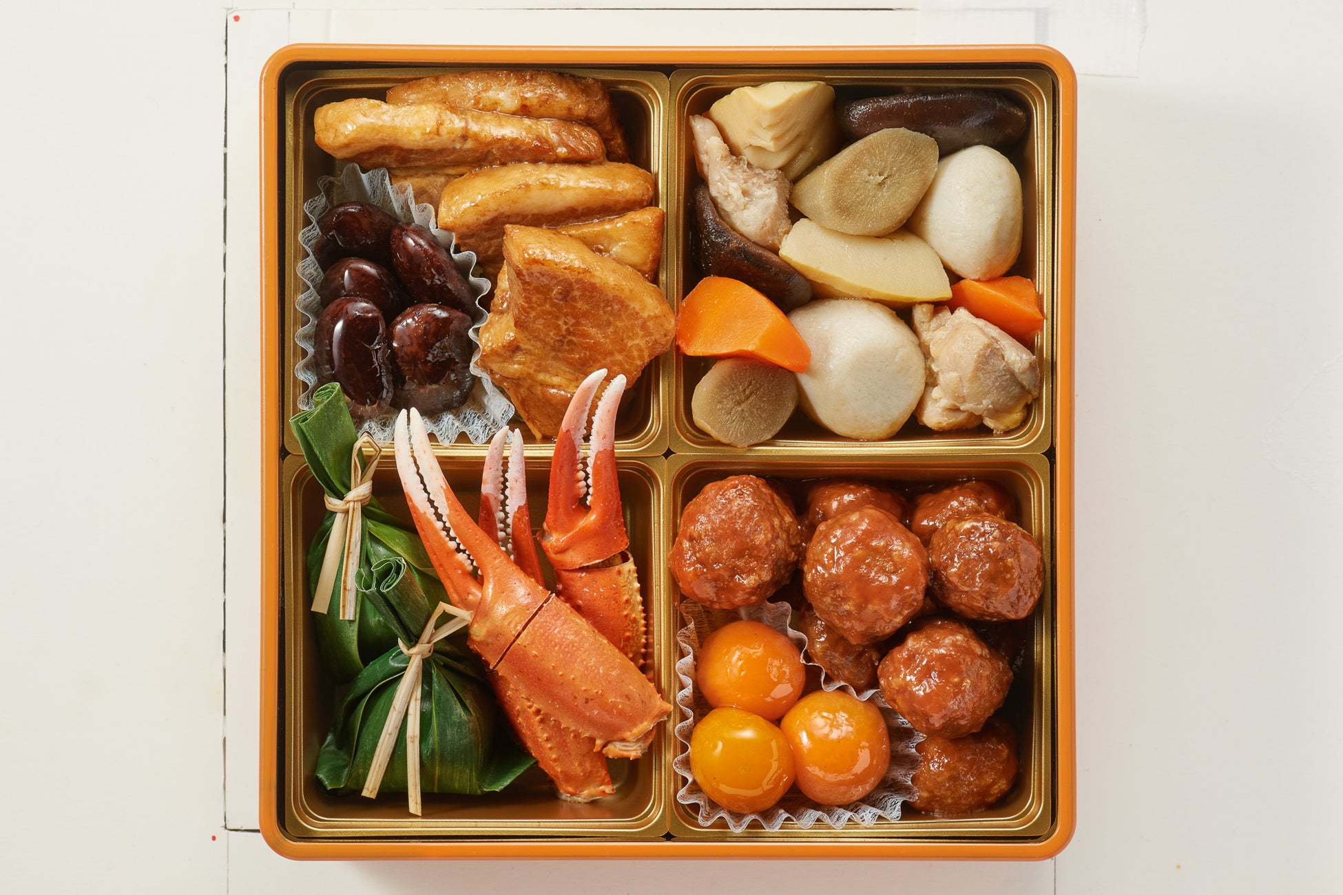 国産金柑の甘露煮は“幸福”(橙に似た金柑は“代々栄える”)、ミートボールは“平和”(万事丸く収まり末永く続く)、国産野菜の筑前煮は“良縁”(様々な食材を一緒に煮込むところから、みんな丸ごと良い縁に結ばれる)などの意味を込めました。