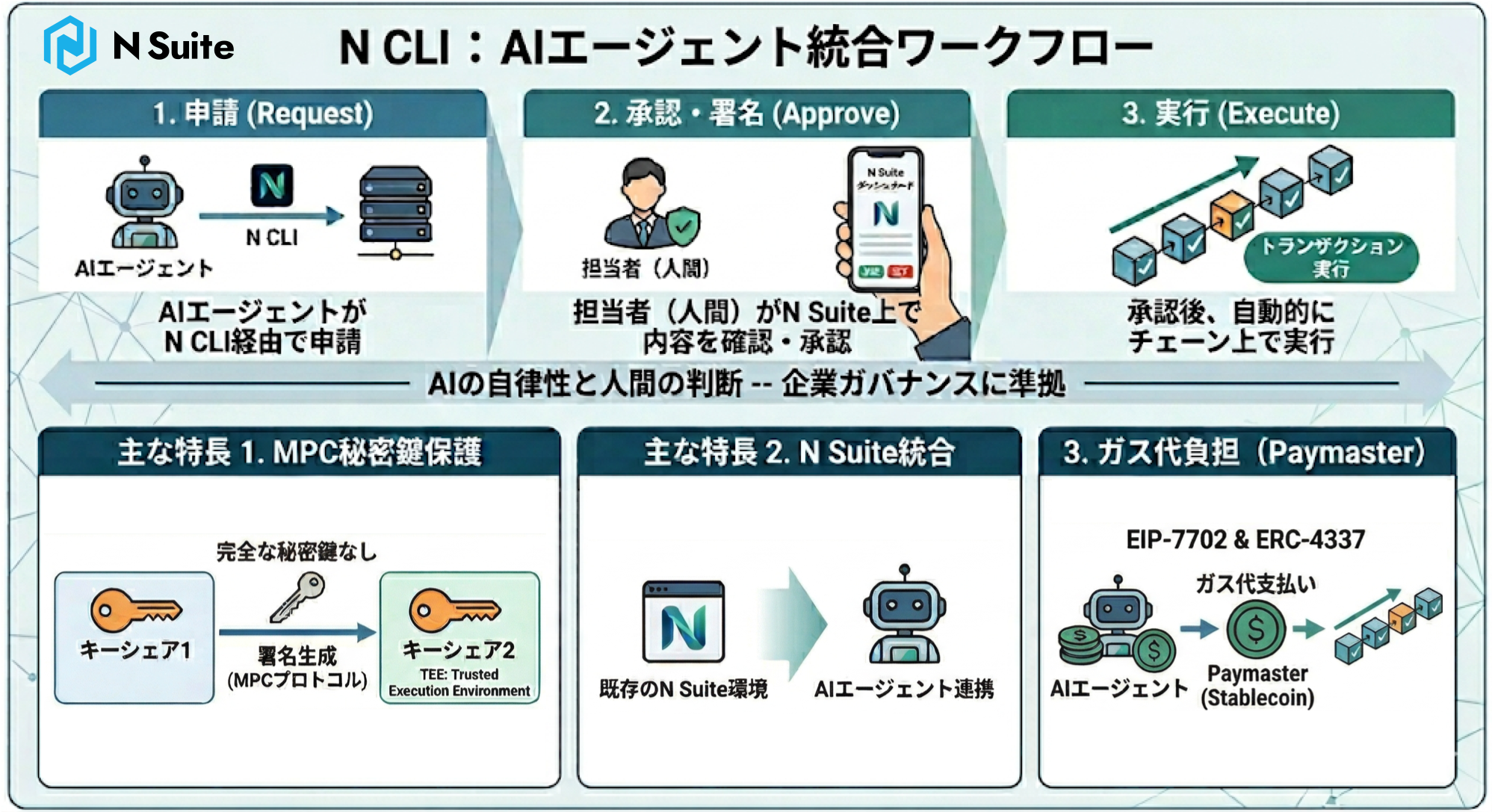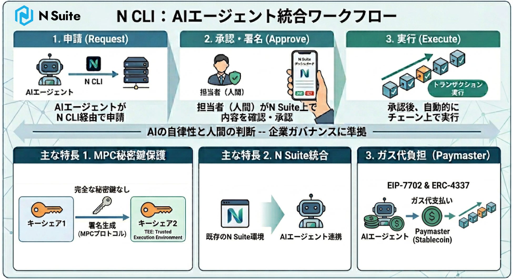 当社は、AIエージェントが企業のブロックチェーン活用において不可欠な存在となる未来を見据え、「N Suite」のAIエージェント対応機能の拡充を進めてまいります。