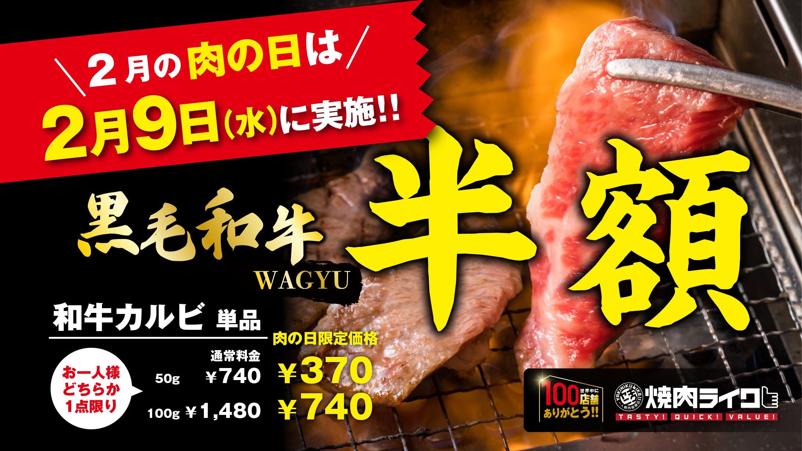 1日限定開催!2月9日(水)の肉の日は黒毛和牛カルビが半額!焼肉ライク70店舗で実施!