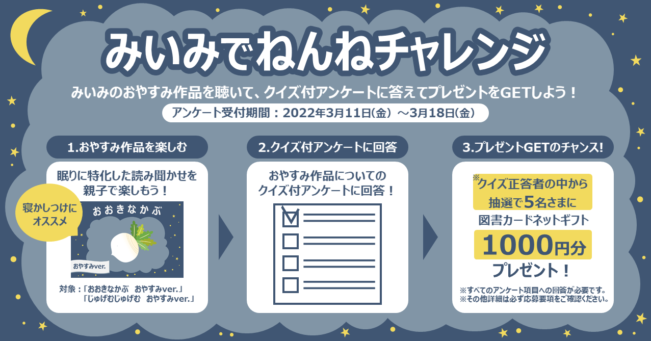 抽選で図書カードネットギフトがもらえる!絵本読み聞かせアプリ「みいみ」キャンペーン開始!!みいみにて寝かしつけ効果についてのアンケートキャンペーンを実施