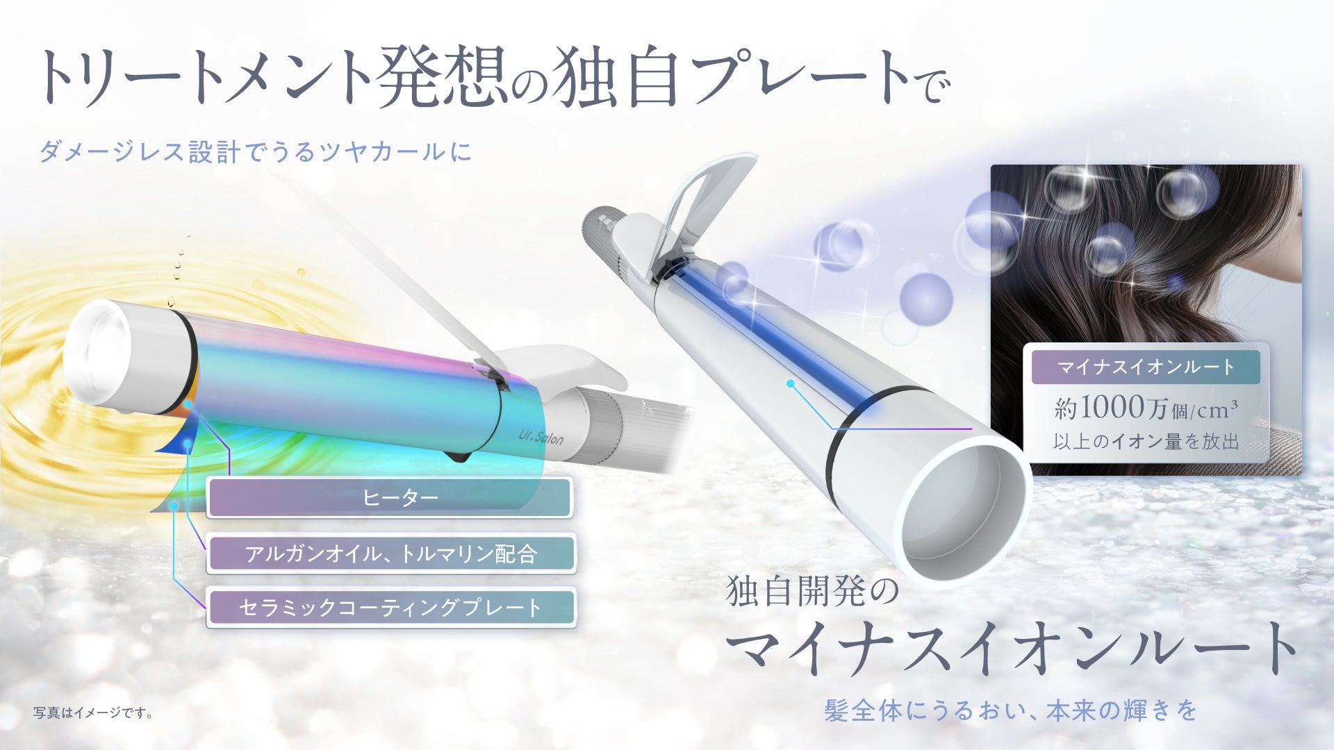 髪への摩擦を減らすセラミックコーティングとアルガンオイル配合のプレートで髪をやさしくケアしながらスタイリング。また、独自のマイナスイオンルート設計により、マイナスイオンが髪全体に均一に行き渡り、うるツヤカールを実現します。