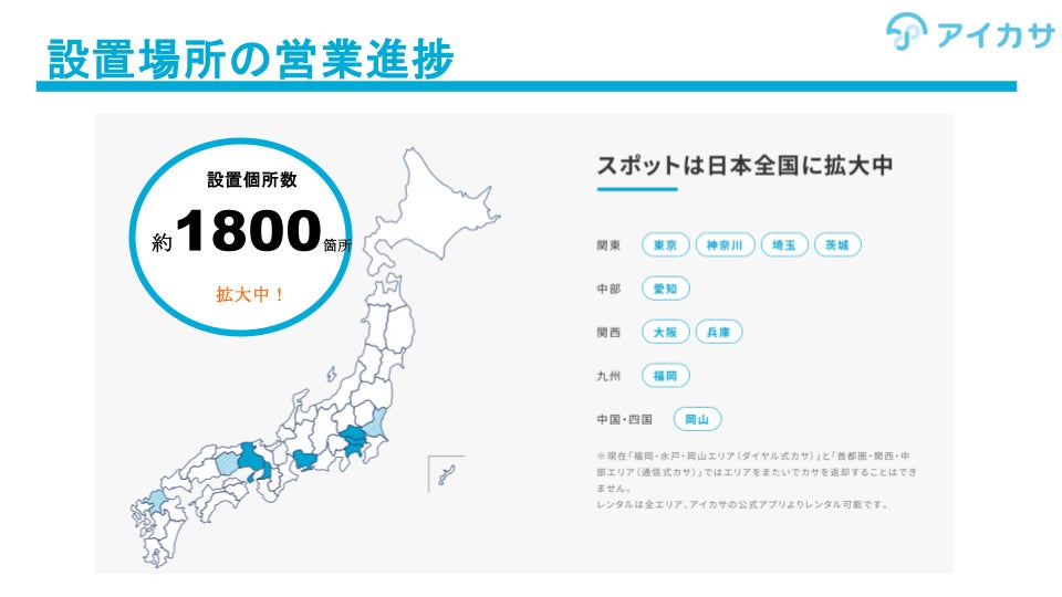 2018年12⽉にサービスを開始したアイカサは、アプリ登録者数75万⼈を超え、東京駅や新宿駅をはじめとした都内全域と関東、関⻄、愛知、岡山、福岡、佐賀など12都道府県で展開するとともに、駅、ビル、オフィス、街、全ての設置数を合わせて、合計1,800か所への設置が完了しました。