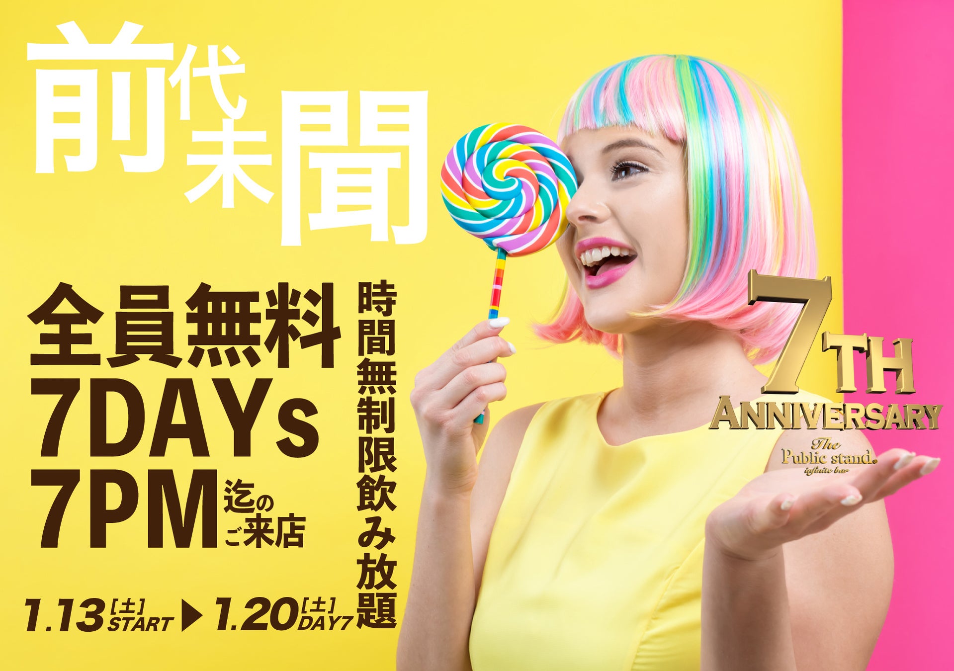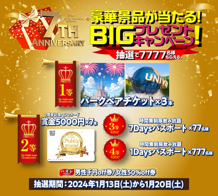 【7周年感謝祭WEEK開催!!】「7日間無料!?」&「豪華景品も当たる」BARパブリックスタンド全店舗で前代未聞の7周年イベントが始まります。