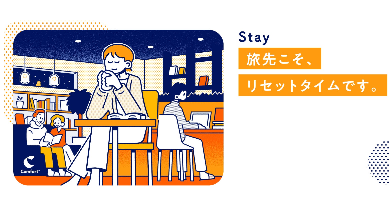 また、これを象徴するキービジュアルは、イラスト展開によってホテルとしての親しみやすさを大切に、コンフォートホテルでお客様に迎えていただける明るくさわやかな心地よい朝を表現しています。 ベースカラーは、太陽の輝きやあたたかさ、親しみやすさを伝えるイエローを採用。このイエローは、世界のコンフォートブランド共通のシンボルであるロゴにおいても「心地よい輝き」を想起させるカラーとして重要な意味をもっており、リフレッシュして新しい1日を迎えることができるような体験を象徴しています。