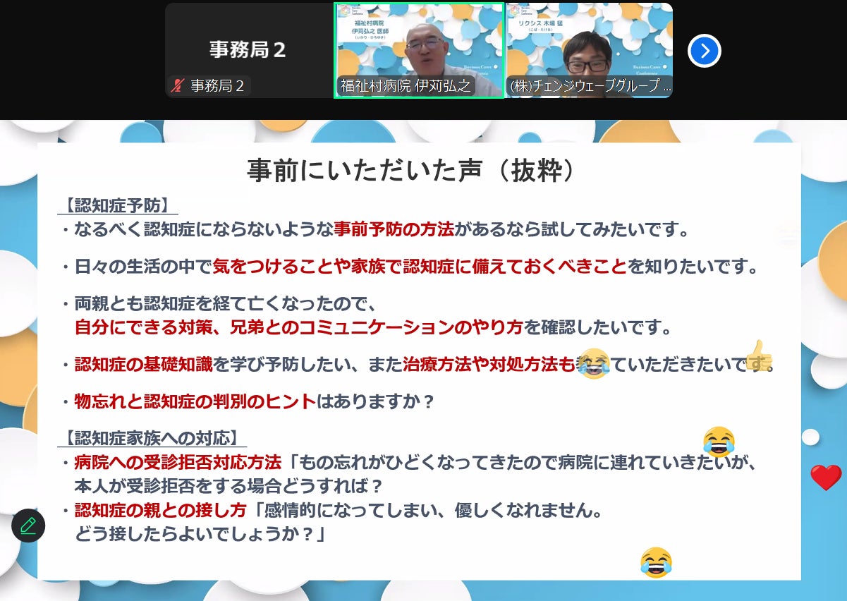 ・認知症専門の先生から具体的なお話を聞けて、ベテランケアラーとしても有意義でした