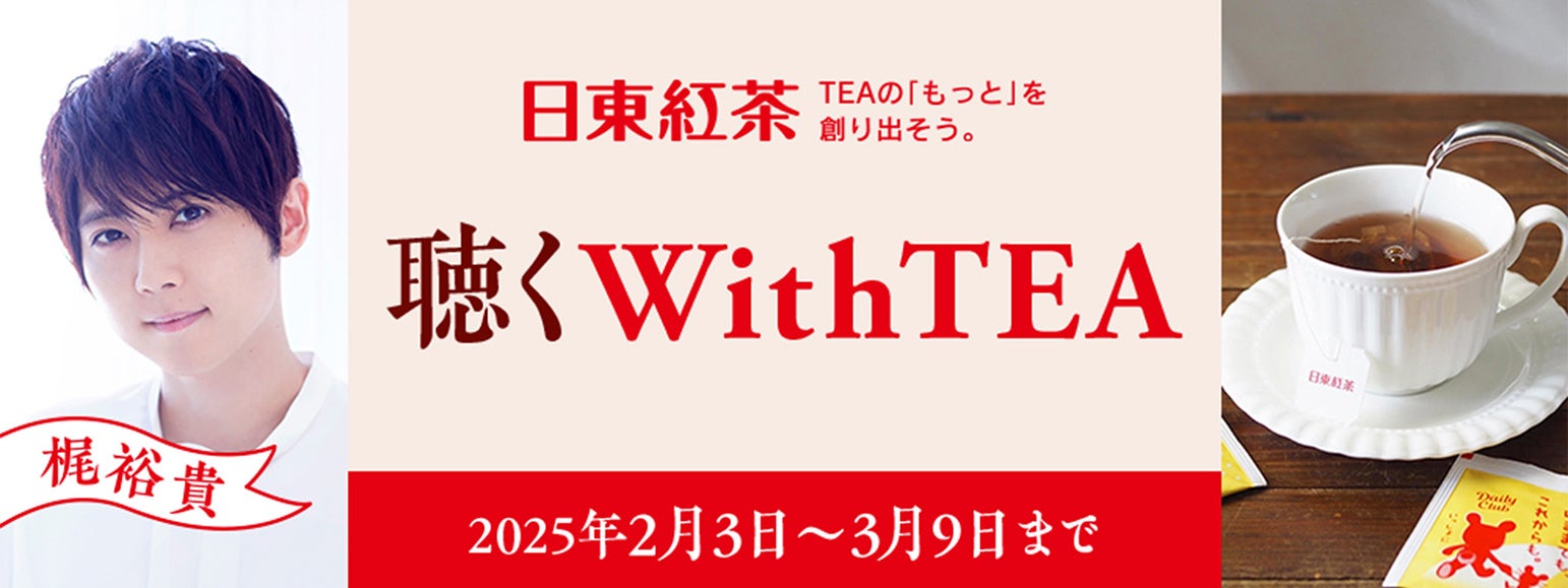「聴くWithTEA」キャンペーンは、日東紅茶の商品、「デイリークラブ」、「ミルクとけだすシリーズ」、「ロイヤルミルクティー」、「水出しアイスティーシリーズ」、それぞれのイメージに合わせて選んだ名作小説を声優の梶裕貴さんが朗読し、その朗読ボイス「WithTEA STORIES」が参加者全員に当たるキャンペーンです。