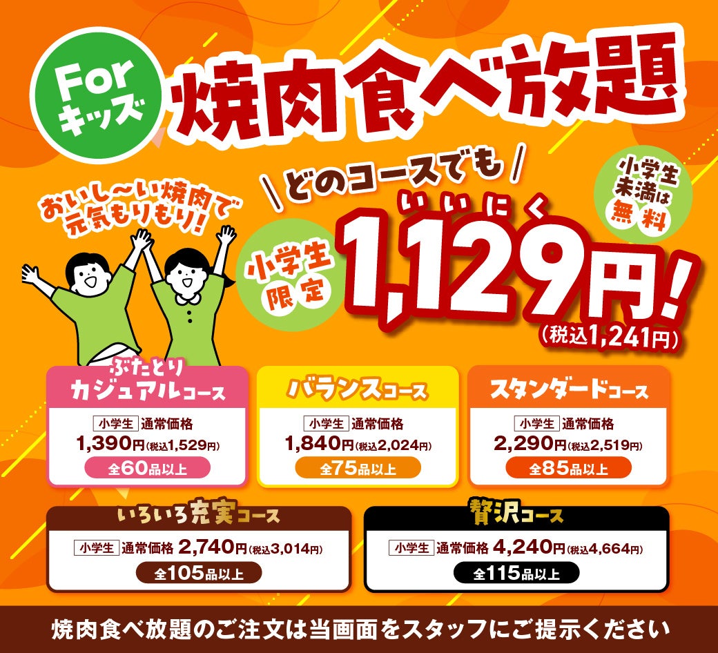 焼肉好きな子どもたちに朗報!どのコースを選んでも、小学生は特別価格で食べ放題OK。