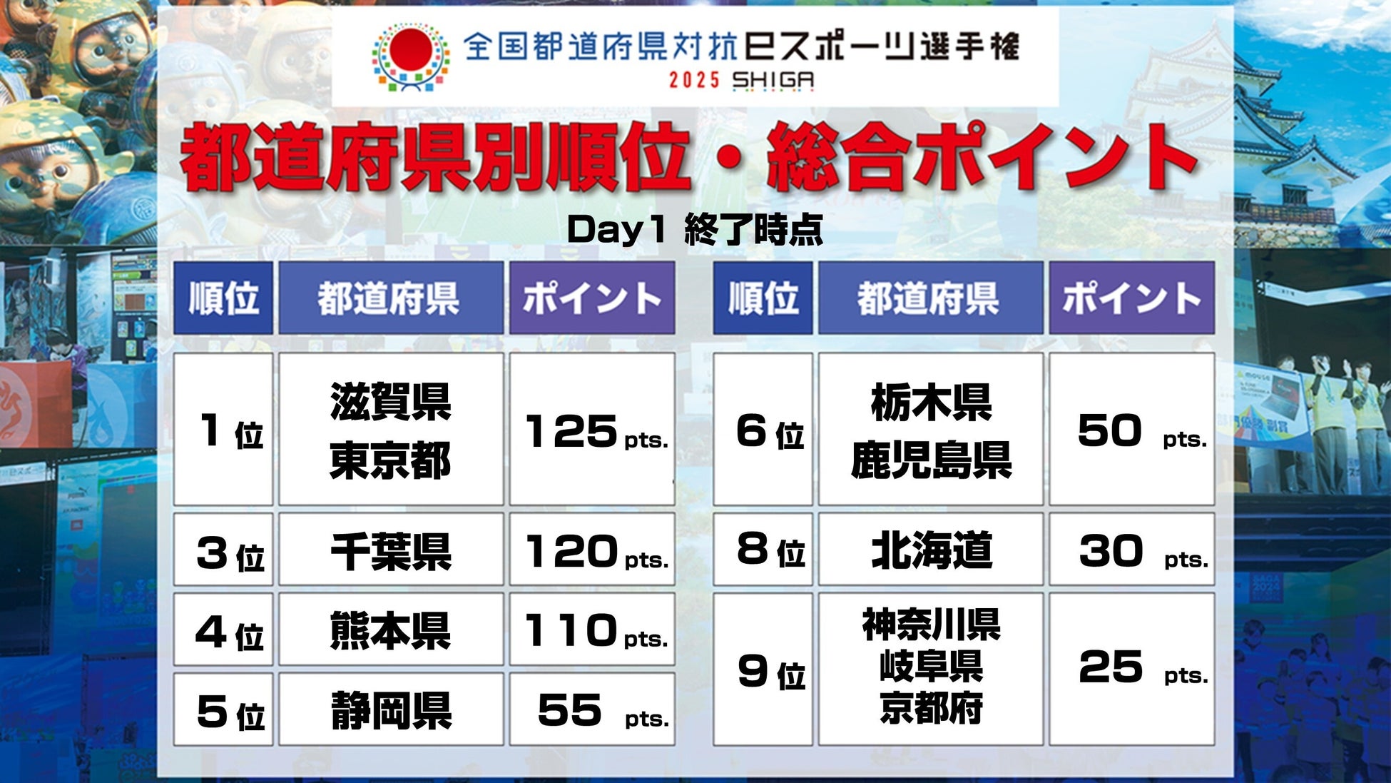 全国都道府県対抗eスポーツ選手権実行委員会は、本日11月22日(土)に開幕した「全国都道府県対抗eスポーツ選手権 2025 SHIGA」(「わたSHIGA輝く国スポ・障スポ」文化プログラム)について、大会初日終了時点の総合成績をお知らせします。
